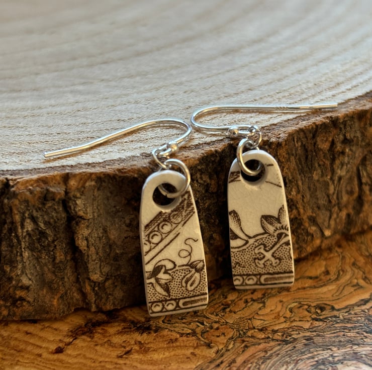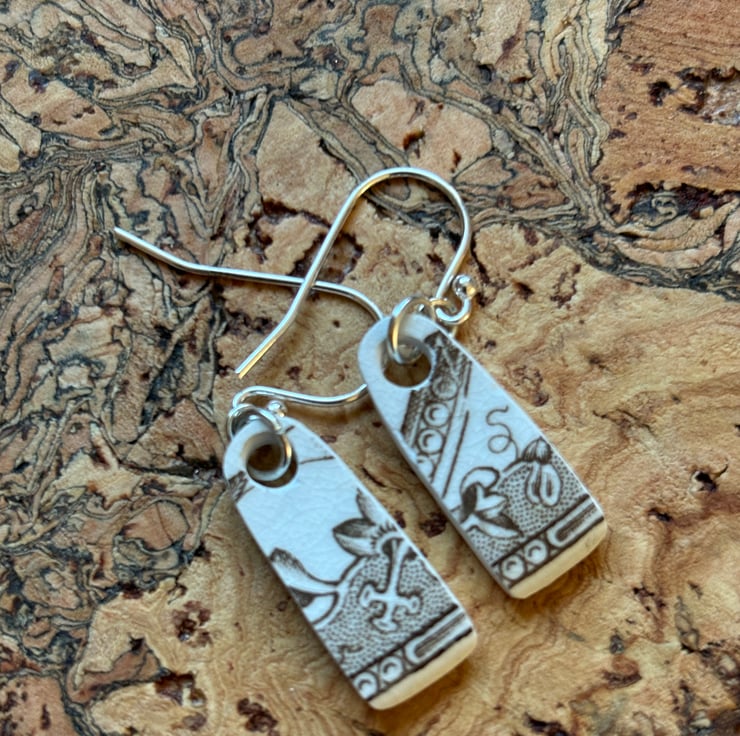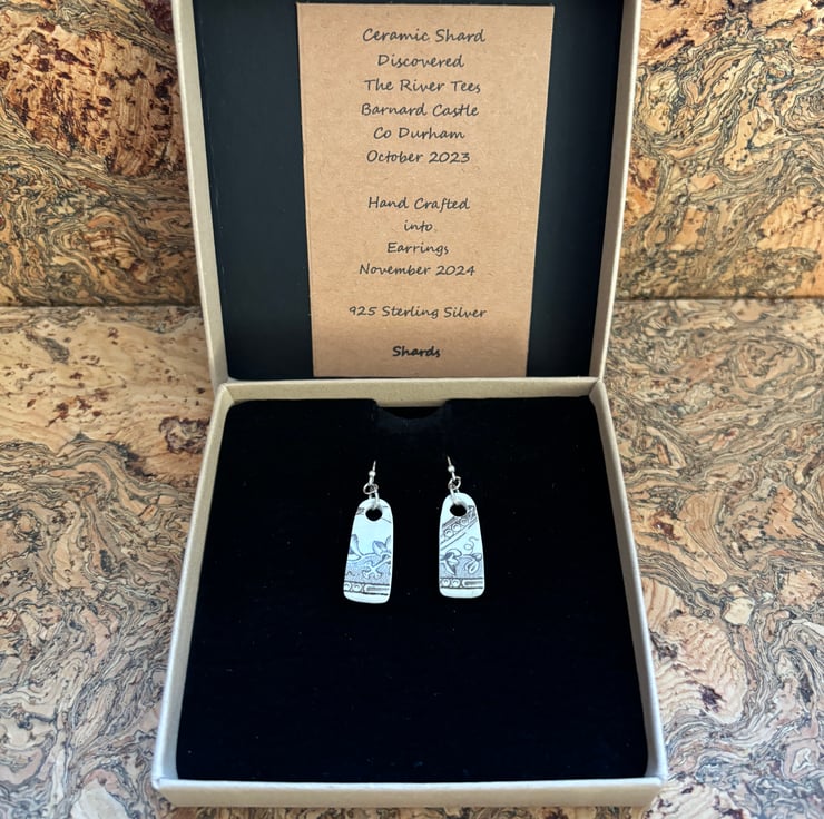 Hand crafted Jewellery and framed artworks using pre loved and discarded ceramics. Ceramic material will show signs of wear and damage. Entire process is a creative experience from discovery to final picture, nothing planned or preconceived. All materials personally collected from river banks, charity shops, roadside, woods, recycle centres, beaches, wherever dropped, dumped or donated ceramics are found, cleaned and shaped into new stories. Each piece comes with a short bio of where the ceramic came from, date found and re-created. Some shards collected are used as found, others are cut randomly which shape the final work. Every piece is individual, nothing replicated, however, due to repetitive patterns in ceramics there will be some similarity but only through the ceramic material not in the final piece.