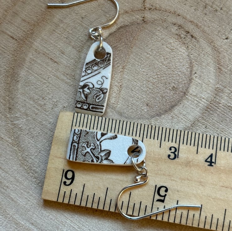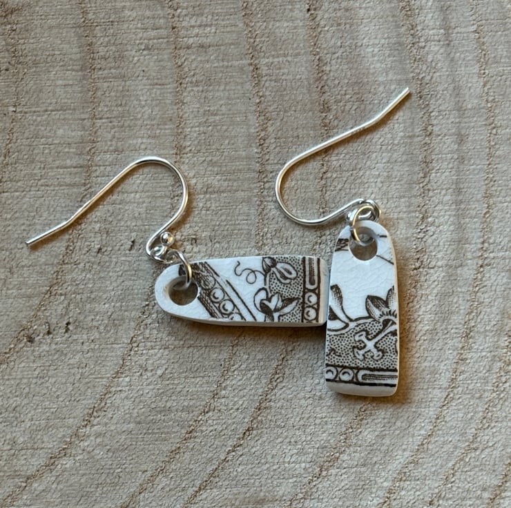 I found a small piece of plate, brown pattern on white ceramic, part of the rim. After a clean I gently clipped the shard to create random shapes. Only two pieces survived, very similar in shape. Front glaze in tact, back fully sanded and sealed with eco friendly matt sealant.