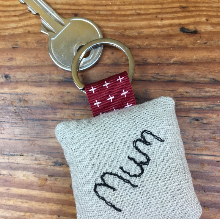 Show your Mum you love her with this lovely handmade keyring. ‘Mum’ is embroidered on one side of the linen square and a heart is appliquéd on the other side. The heart is in burgundy red with sweet flowers and delicate leaves, all highlighted subtly with gold.