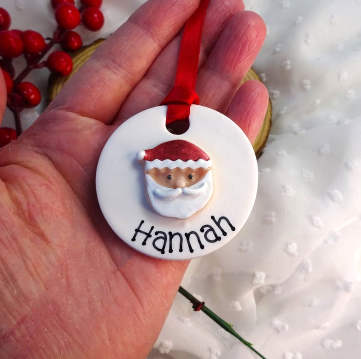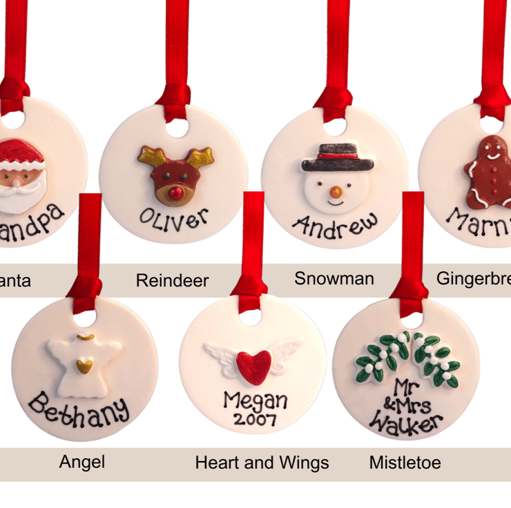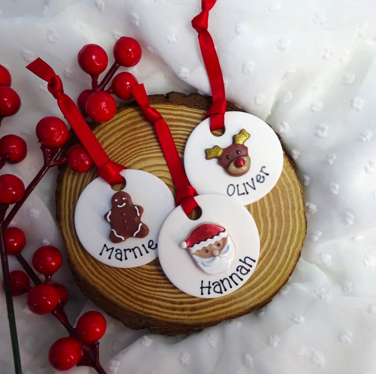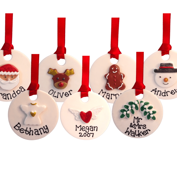 Each decoration takes the form of a white polymer clay circle measuring 2" round. The handcrafted polymer clay image is carefully added within this circle and finished with hand painted details, bringing your Christmas characters to life. Every ornament is finished with a 2 1/4" red ribbon, ready to hang on your tree and add a splash of colour to your festive décor.