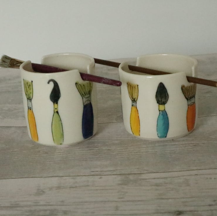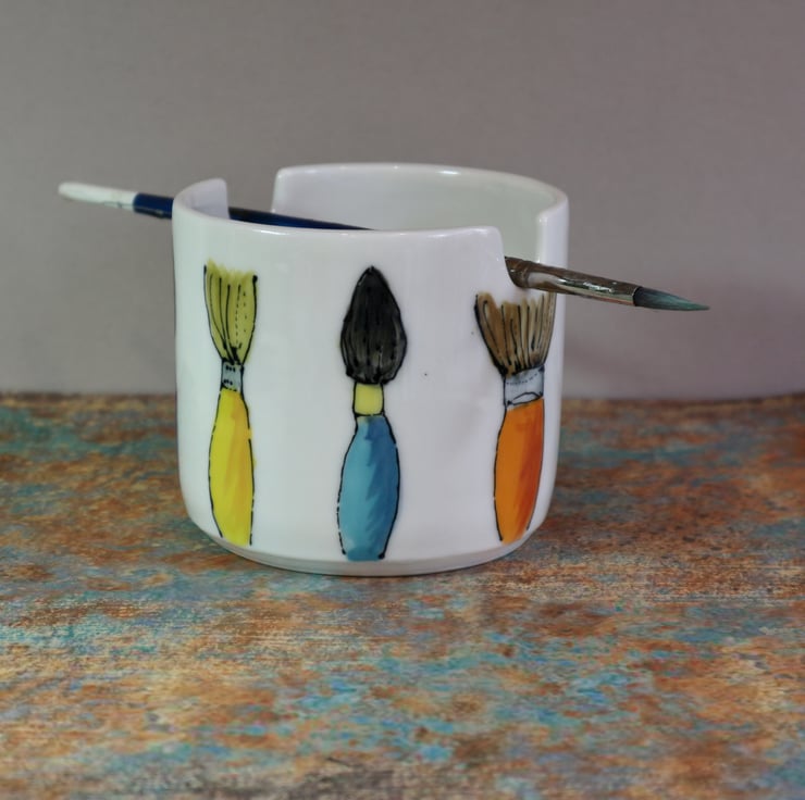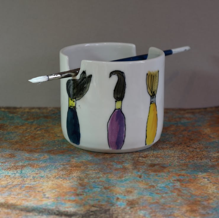 Hand thrown porcelain with hand painted brushes. Small grooves allow you to rest the brush in. Fully glazed, so you can use for your painting water. This stops you losing the brush somewhere on your desk! Each one is hand painted and therefore unique. Approx. 10cm high