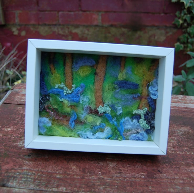 Needle felted onto hand dyed wool pre-felt and highlighted with a touch of hand embroidery. Wool curls add lots of texture. Framed in a white wood box frame without glass. Also available without the frame so you can display in your own choice of frame.