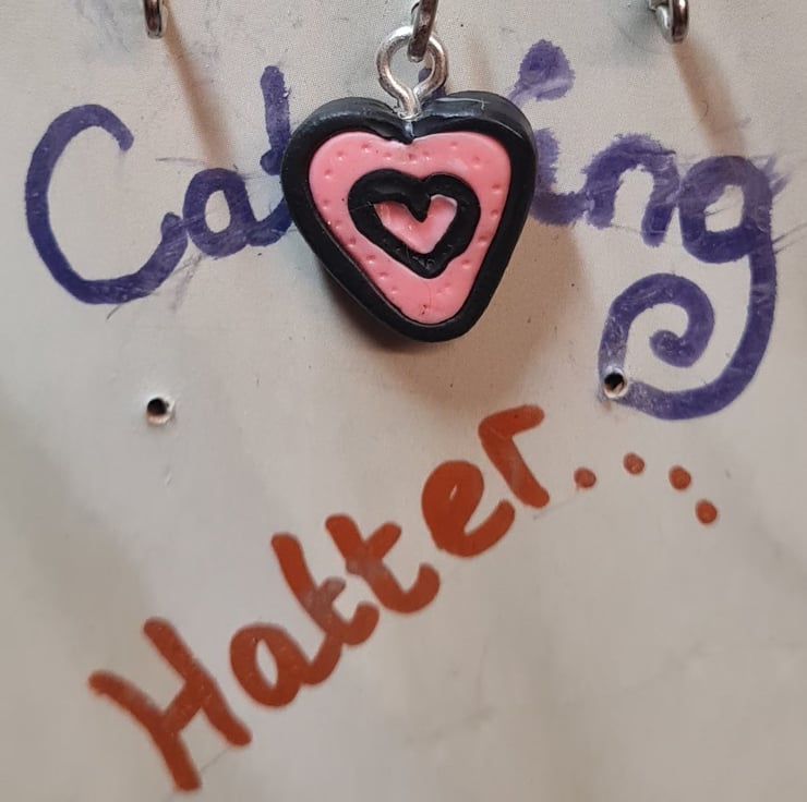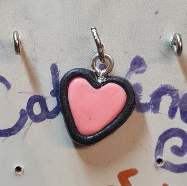 A handmade pink and black polymer clay heart shaped pendant. This heart has a pink and black repeating pattern. This heart is 2 cm long including the silver coloured metal hook.The heart itself is 1.5 cm long and is 1.5 cm wide and is 0.5 cm thick.