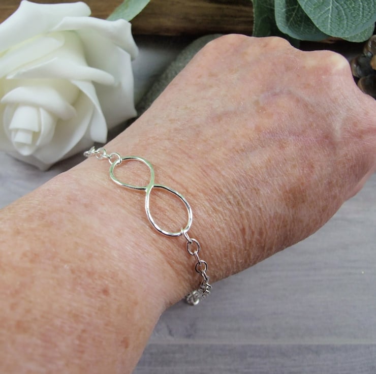 The bracelet centre piece is made from 1.5mm solid sterling silver wire which I have cut, shaped by hand and soldered. Securely soldered to sturdy sterling silver chain with lobster clasp closure.