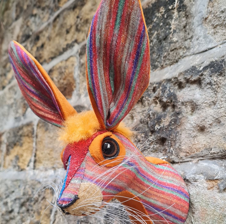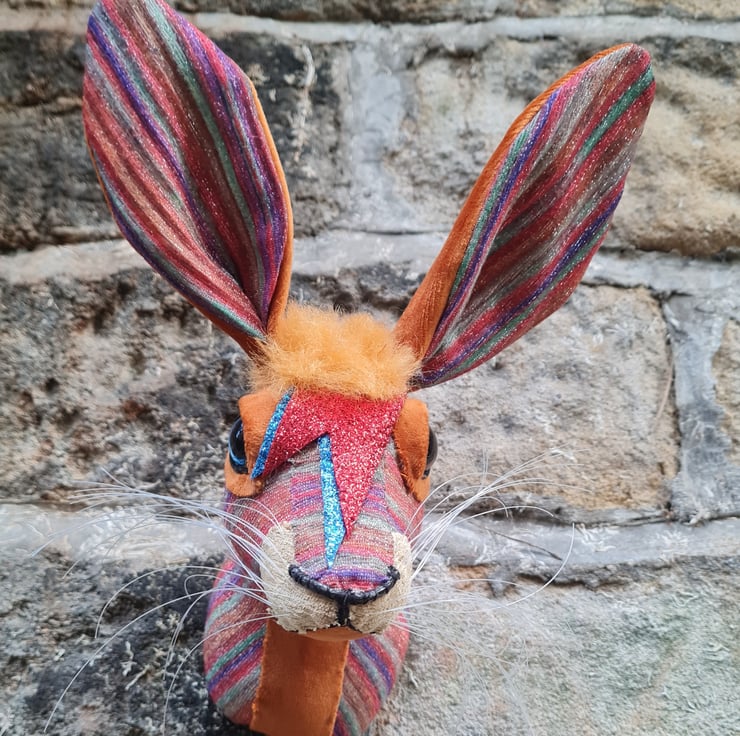 This is Ziggy Haredust. A lifesize faux hare which I have handmade and covered in multi coloured striped lurex fabric.