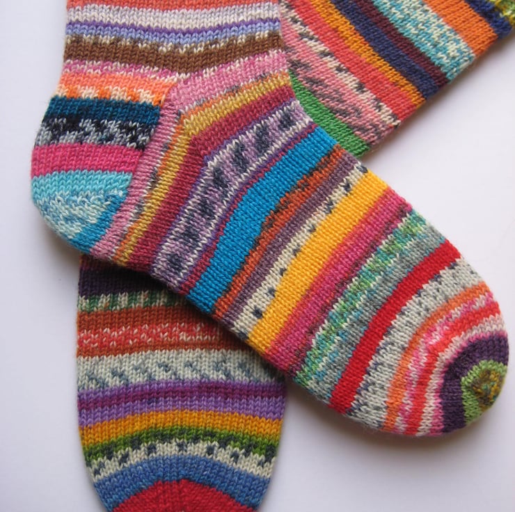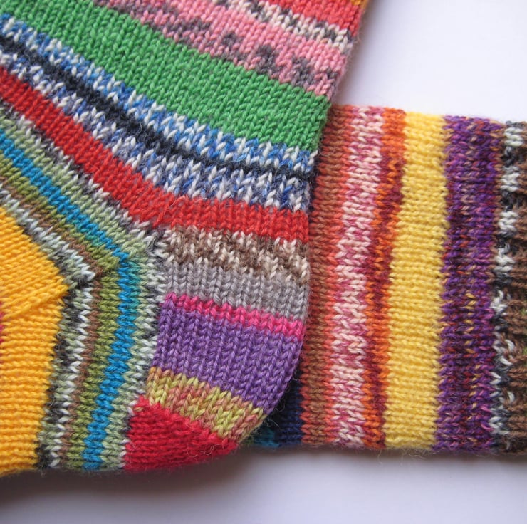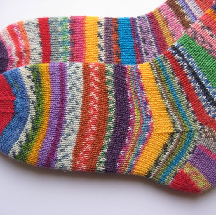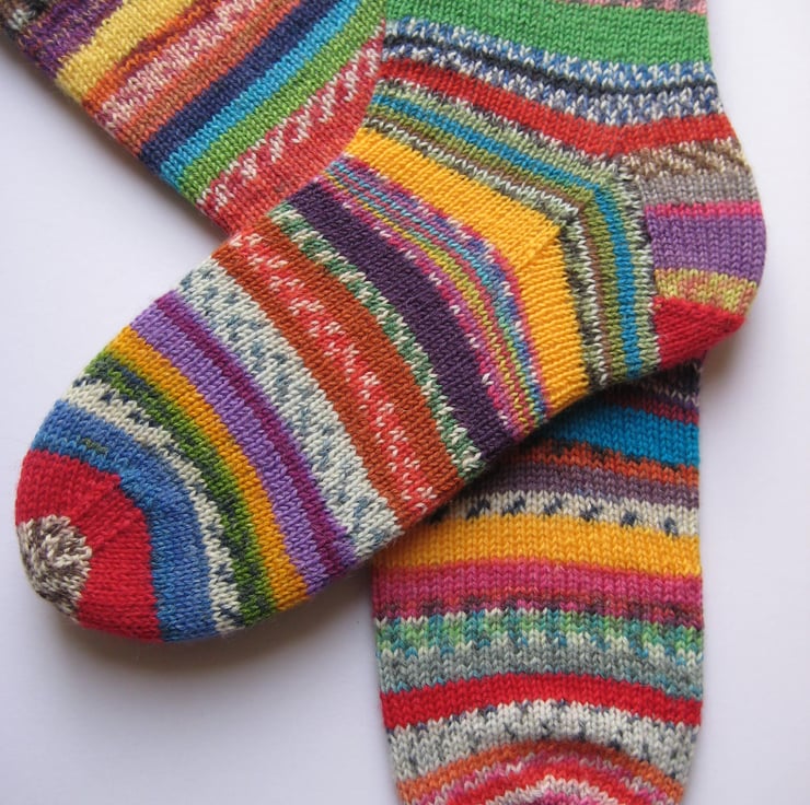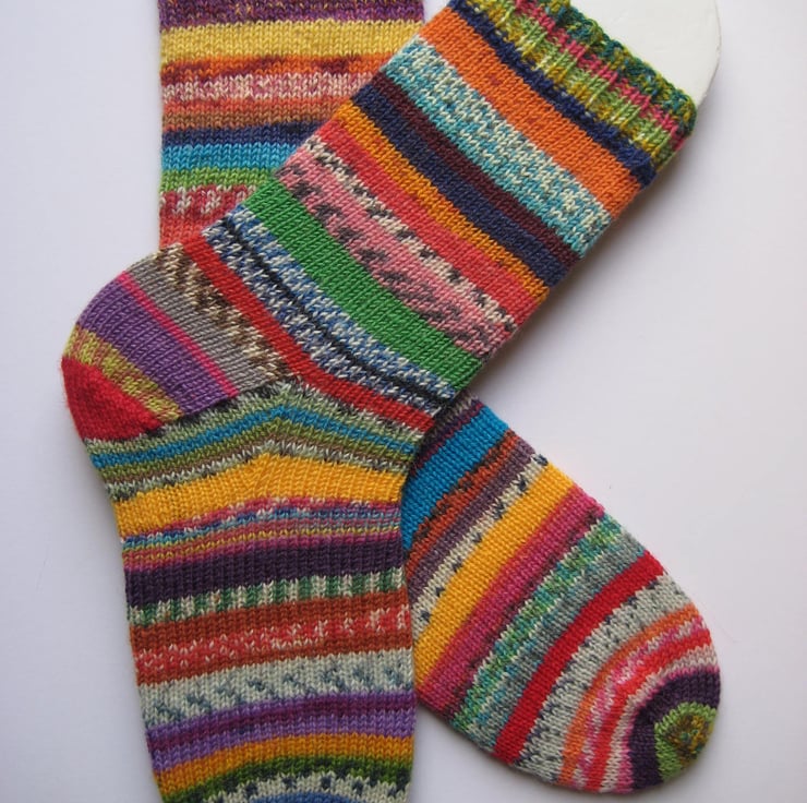 Hand knitted scrappy wool socks made from many different 4 ply (fine, not thick) self patterning sock yarns - in just about every colour you can think of!