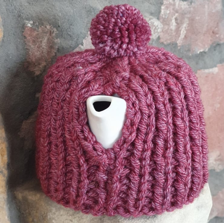 Hand knitted using double strands (two balls at the same time) of Aran weight yarn in a 1 x1 ribbed pattern, makes this cosy extra thick. It's not called a cosy for nothing!