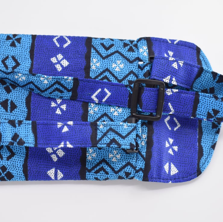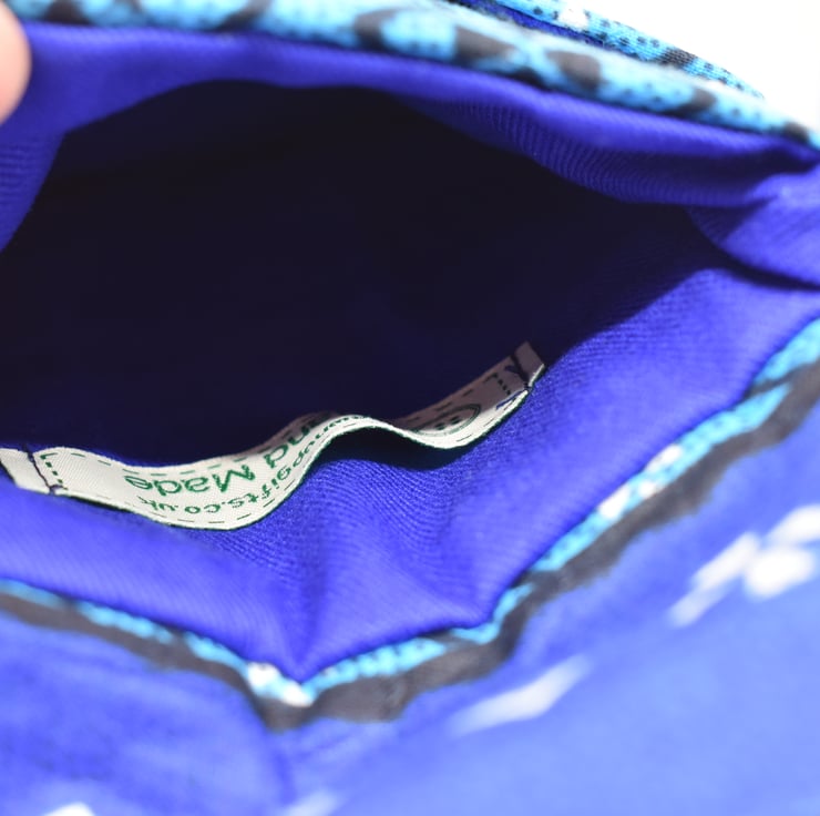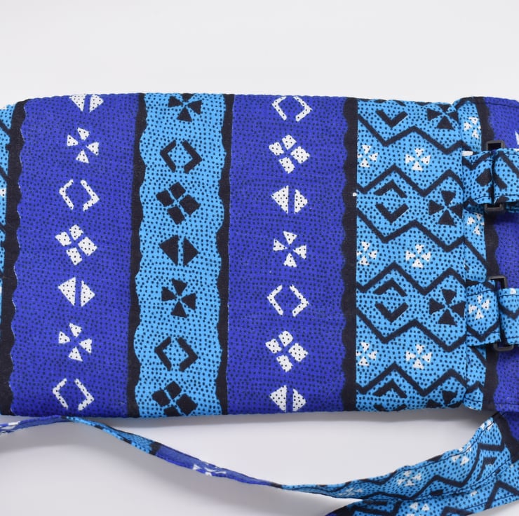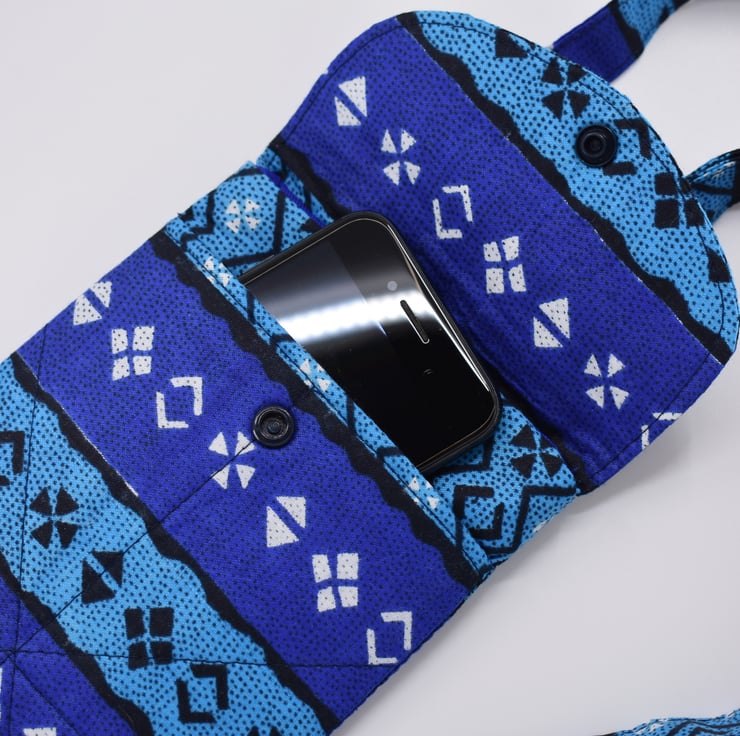 Sewn from a bright printed African waxed cotton the case is fully interfaced and slightly padded to protect your tech and keep the case smart. The lining is a coordinating blue drill fabric soft and strong. Ther is a main section and a front pocket and the flap is secured with a blue plastic snap.