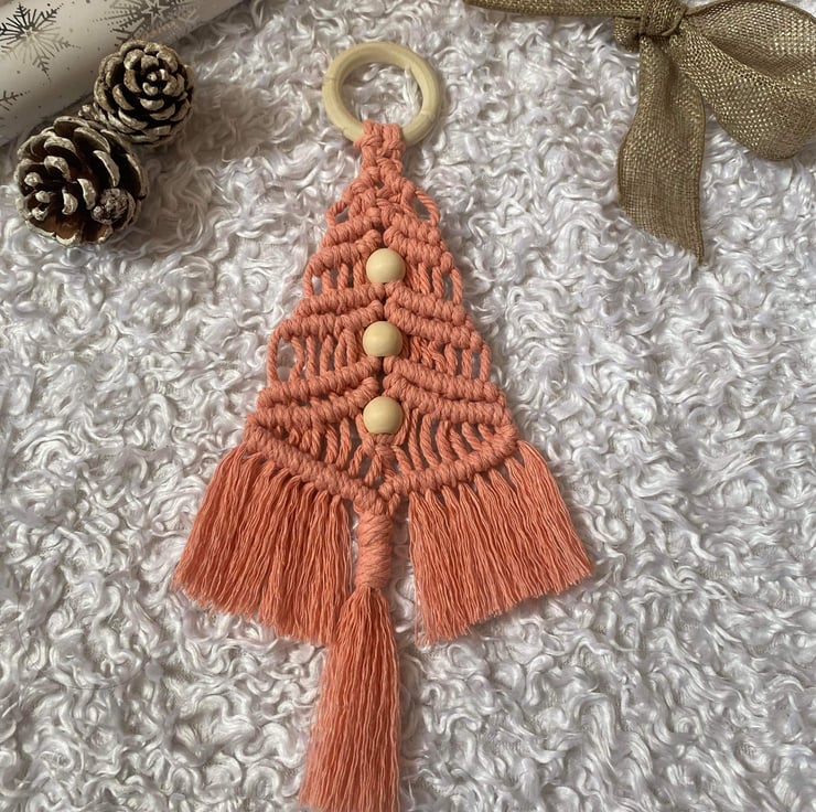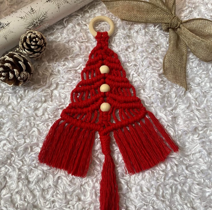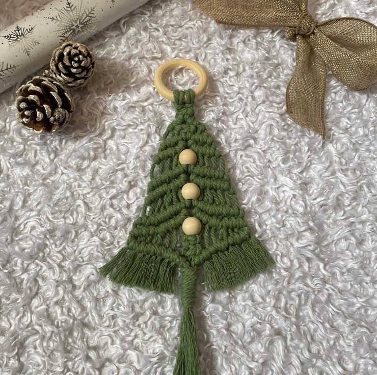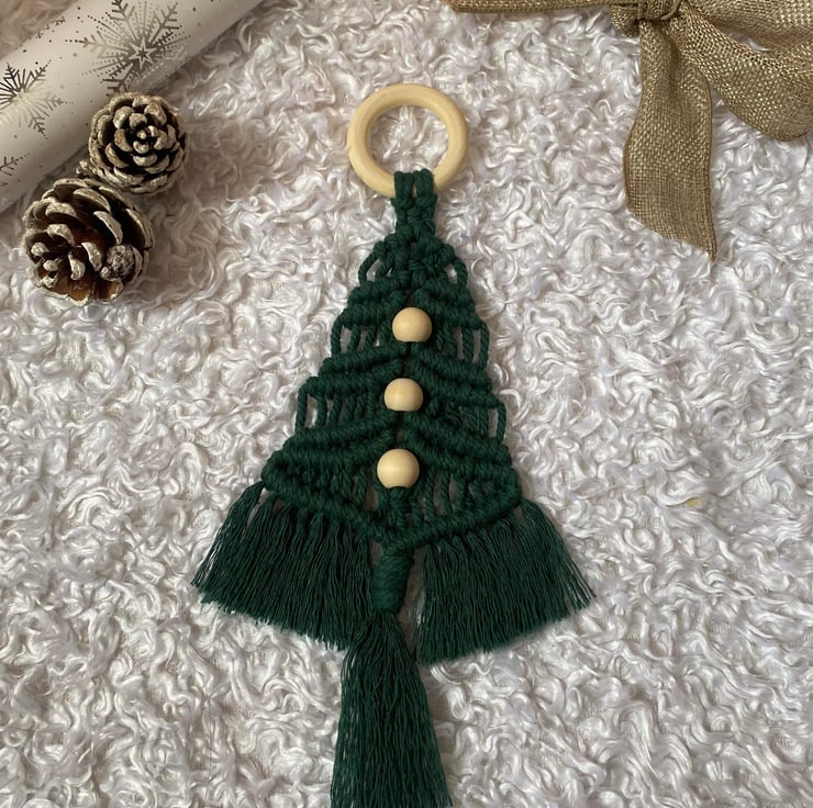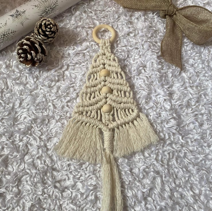 These lovely macrame Christmas Tree Hangings are hand-knitted in Dorset from 3mm cotton macrame cord with 3 natural wood beads all hanging from a natural wood ring.