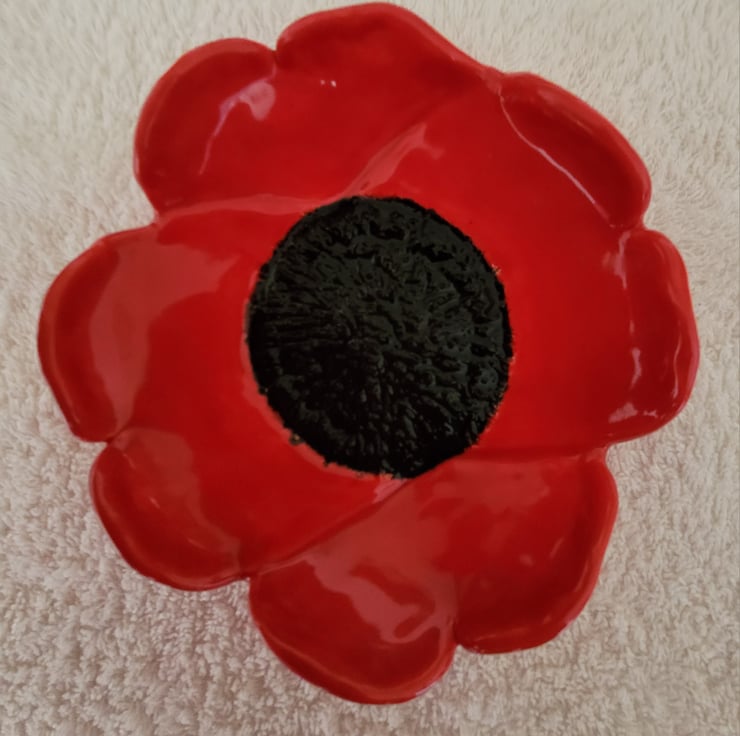 This handcrafted ceramic dish has been created from white earthenware clay using the slab-work method and shaping each petal. Each petal is secured with slip and the centre formed by using a sculpting tool before the dish is shaped into a mould. Once dried it has been bisque fired to 1000C and lightly sanded and hand-painted with three coats of red and black glaze. After glazing it has had a second firing in the kiln to 1080C.