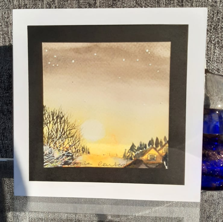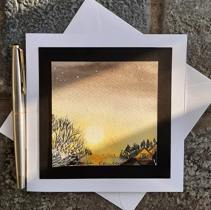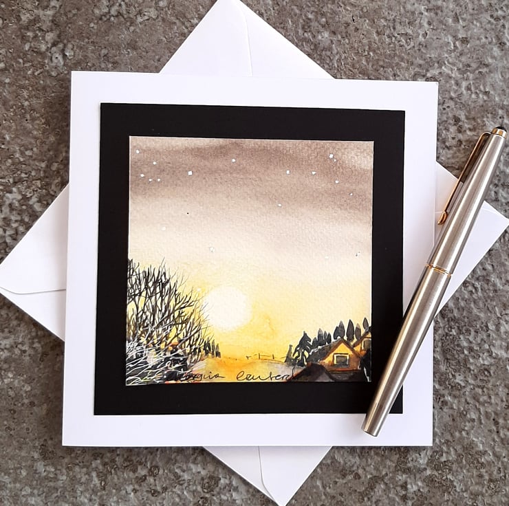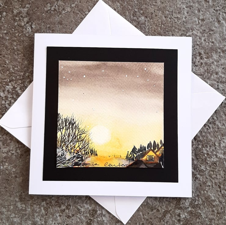 Beautiful watercolour painting made into a card of the sun setting with trees and cottages