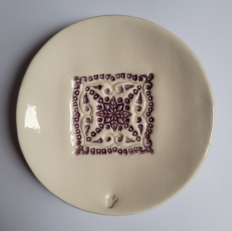 This handcrafted ceramic dish has been created using the slab-work method and embossed with a mandala design using an Indian carved stamp before shaping into a mould. Once dried it has been bisque fired to 1000C and hand-painted with a coloured glaze and a clear glaze has been added. After glazing it has had a second firing in the kiln to 1080C.