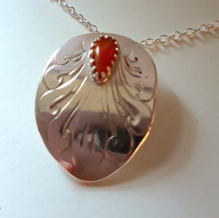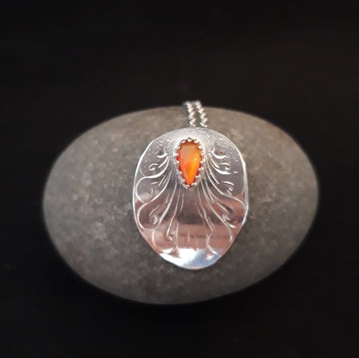 This lovely embossed teardrop shaped piece of silver features a small bright orange teardrop of aurora opal. Aurora opal is a manufactured alternative to mined opals without the impact of heavy duty mining.