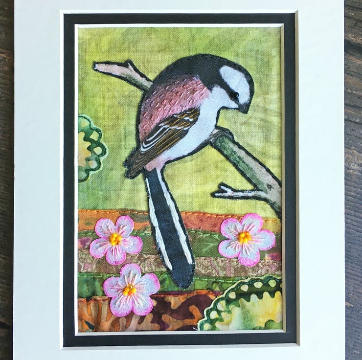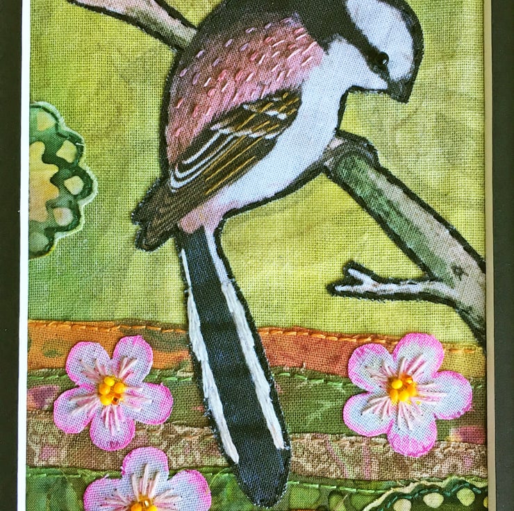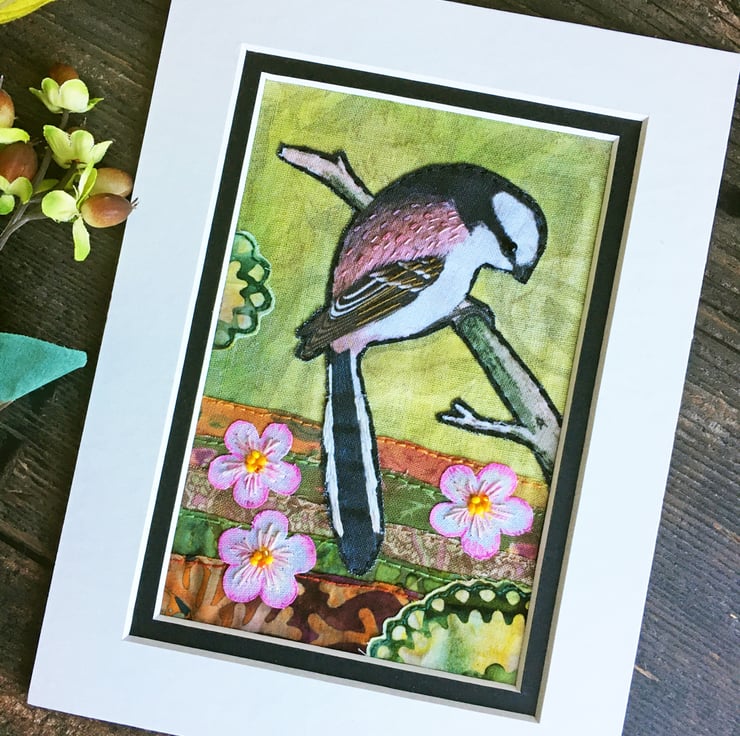 This little artwork features a textile print of vintage painting of a long-tailed tit. I've created the scene using sections of batik and cotton fabrics, some of which I've tinted with acrylic paints and inks. The fabrics have been layered and sewn by hand and I've used embroidery threads and seed beads to add details and texture.