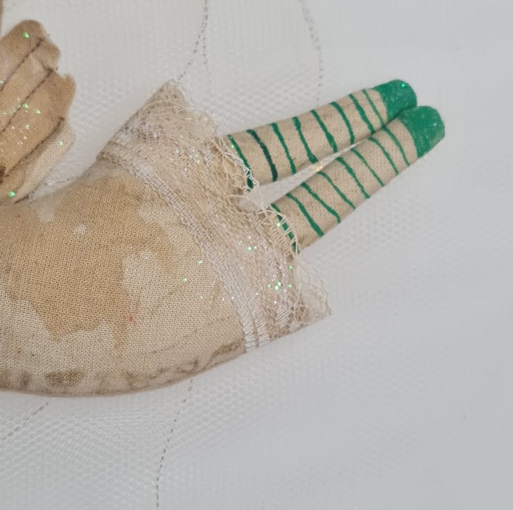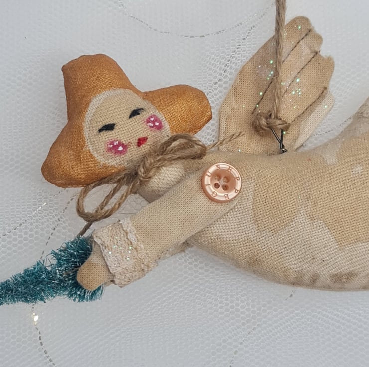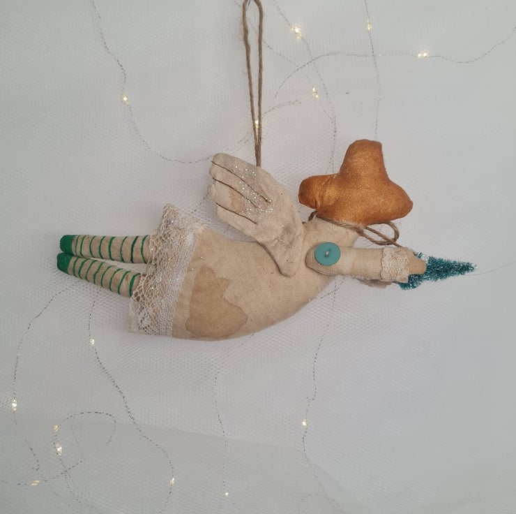 This quirtky little angel is hand and machine stitiched in unbleached cotton. Hand stained and painted. with lace stained to look aged trims. A button embellishes each arm, and a peppering of sparkles to finish off. . She holds a little christmas tree on her way to the festivities.