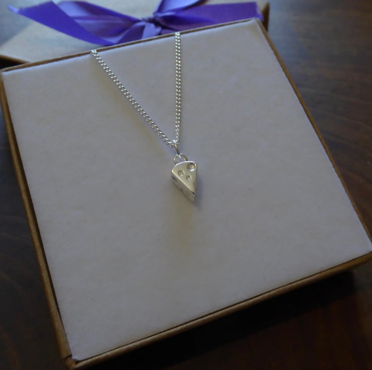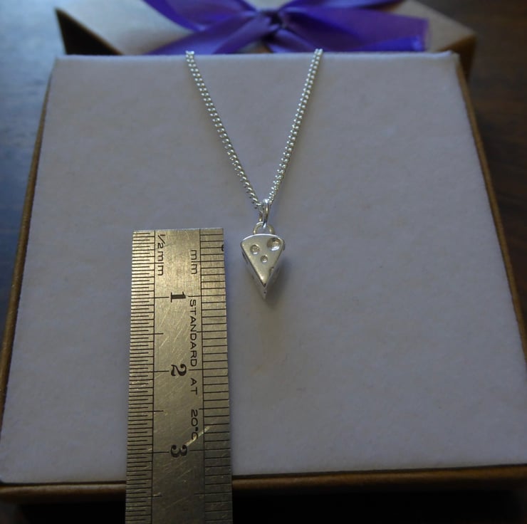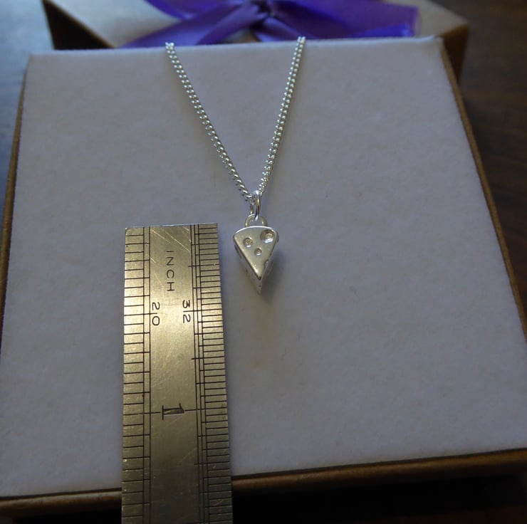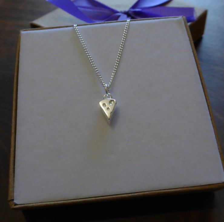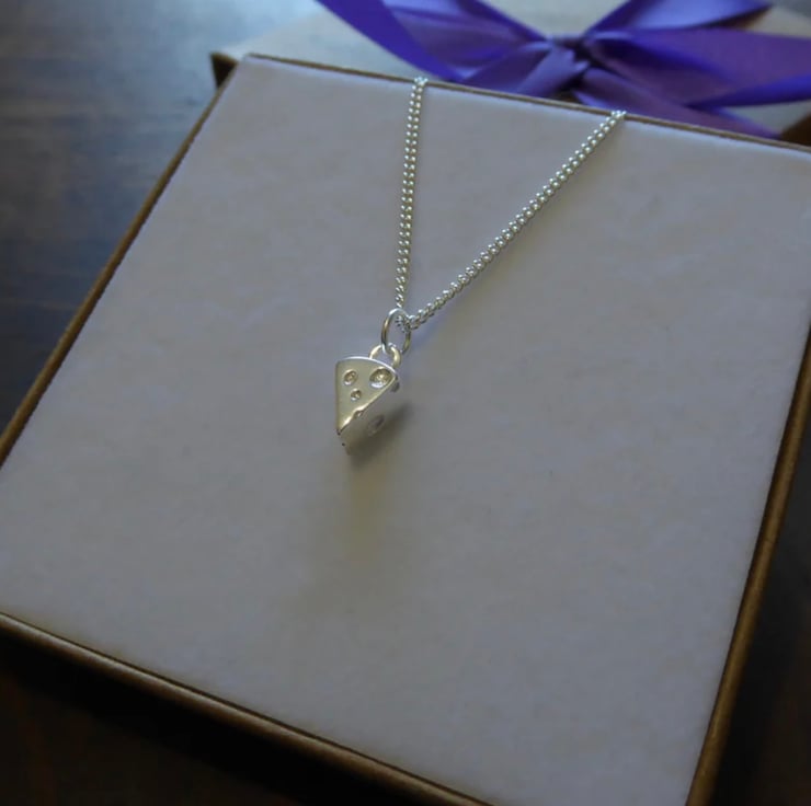 A cute little silver cheese charm, a cute charm to wear on a nice silver trace chain.