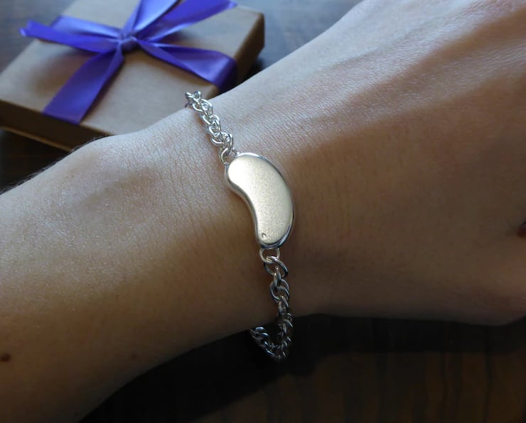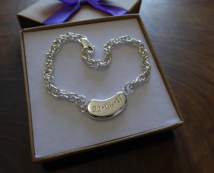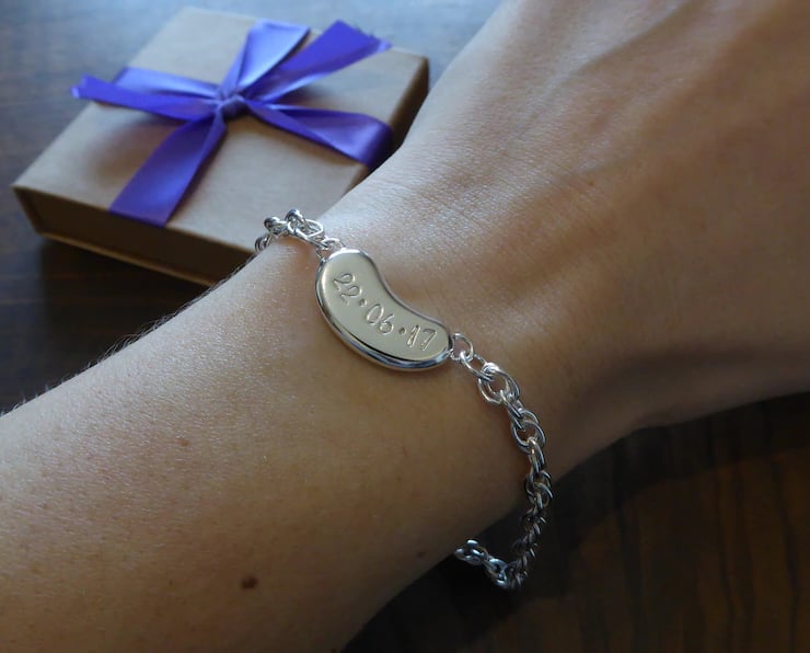 A handmade silver kidney charm bracelet. The kidney is hand cut from 2mm thick Argentium silver, it can be personalised with a date of your choice, the date will be in this format: 01.01.01