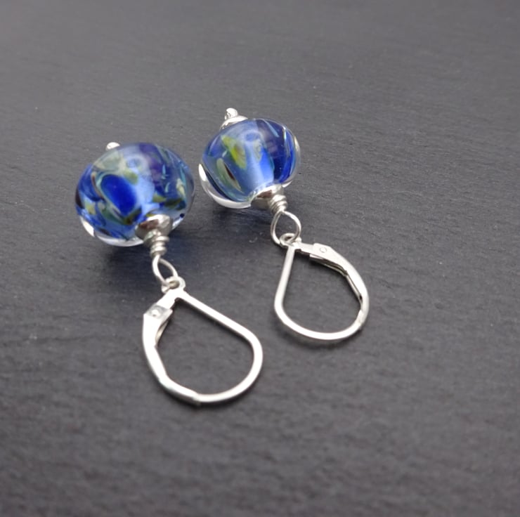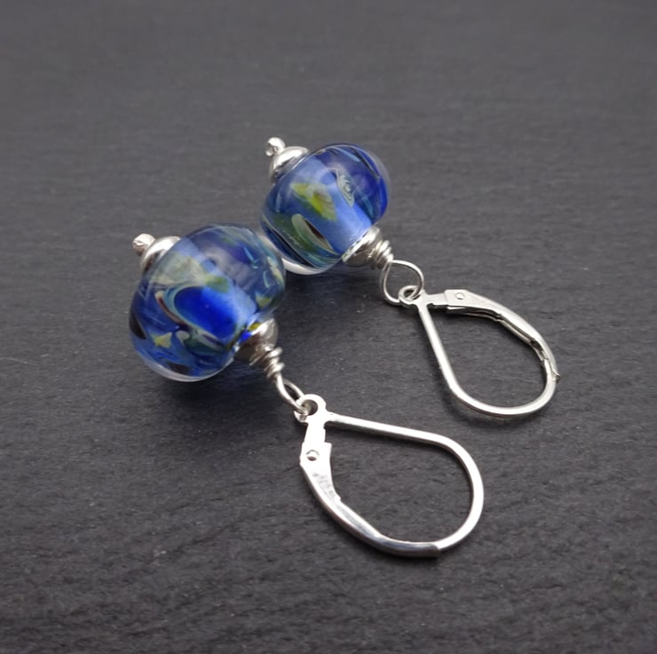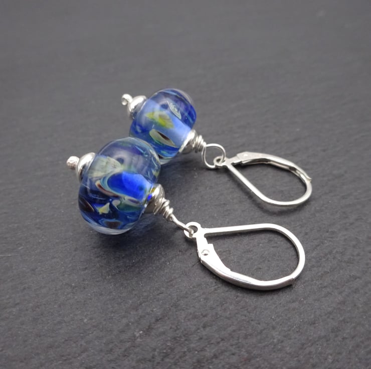 A pair of earrings made with sterling silver lever back ear wires, sterling silver beads and handmade lampwork glass beads.
