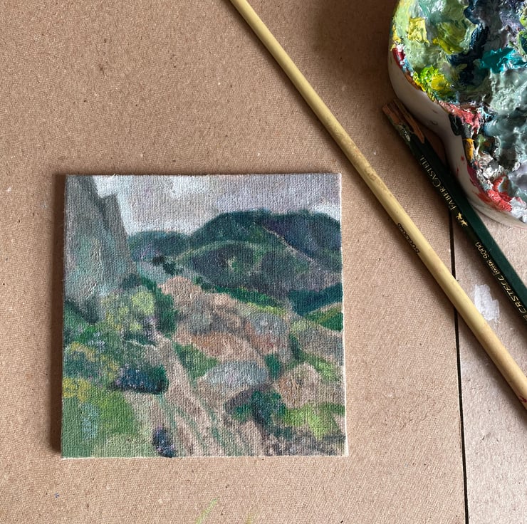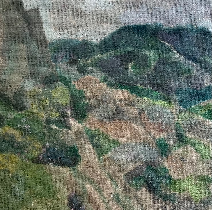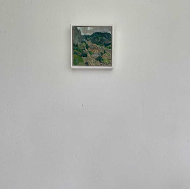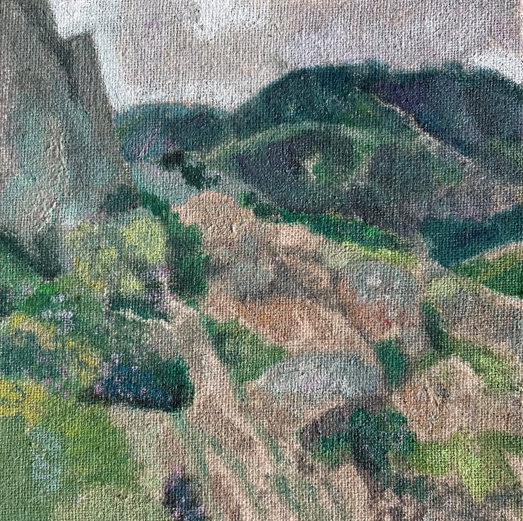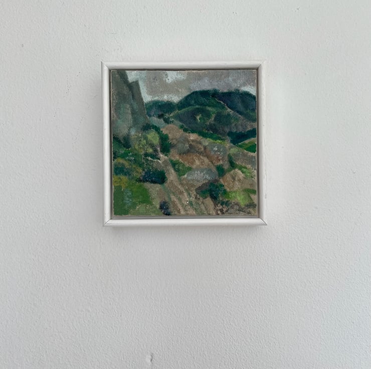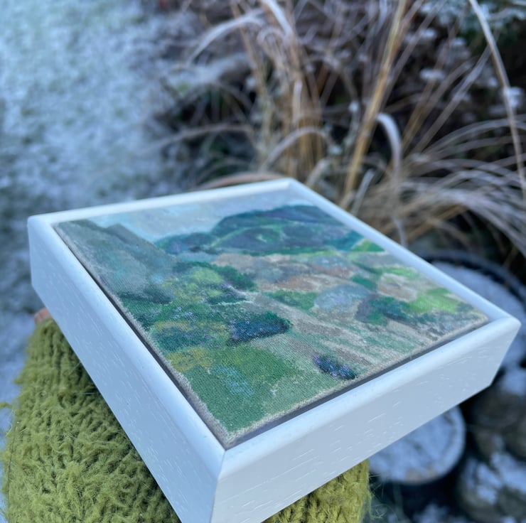 This is a painting of the top of Haystacks in the Lake District UK. I favourite walking spot for me and my family. Its is painted on linen and framed in a simple, white frame.