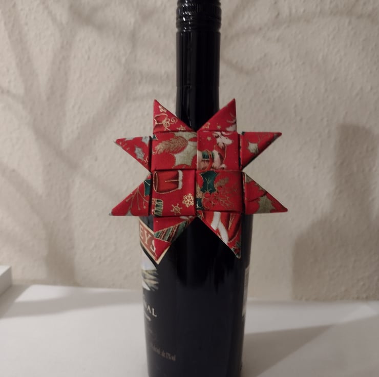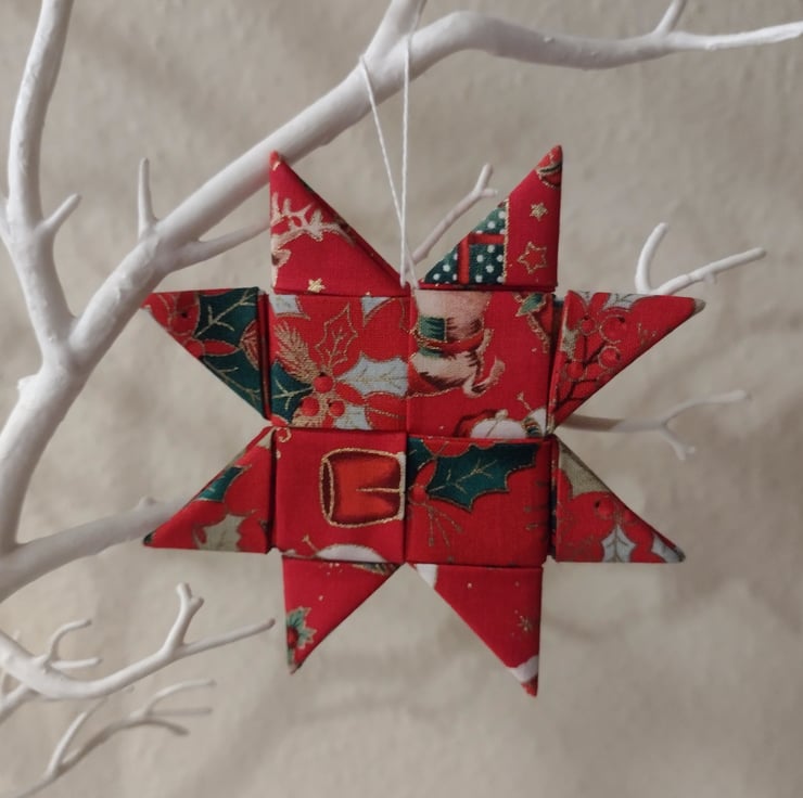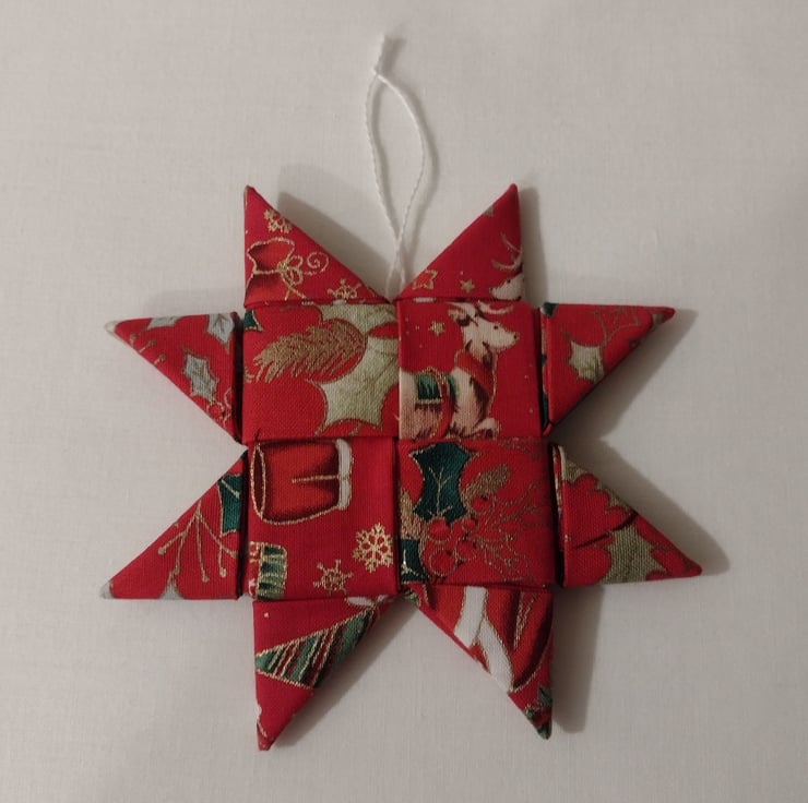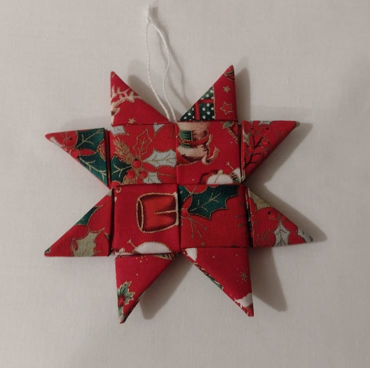 It is made from leftover strips of fabric cut to size and folded and tucked to form the star. It can be made from different colours and patterned fabric also not necessarily for Christmas.
