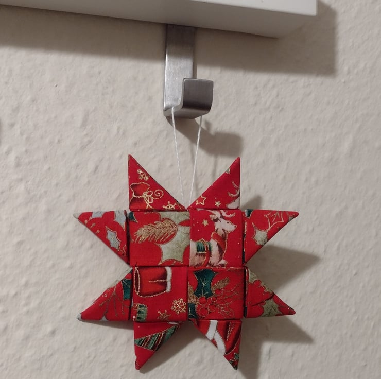 A Christmassy-patterned cotton fabric star in red with added touches of white, green, gold and beige in the pattern. It is folded in the Scandinavian style without stitching and here only tiny dots of fabric glue used to keep it from easing apart.