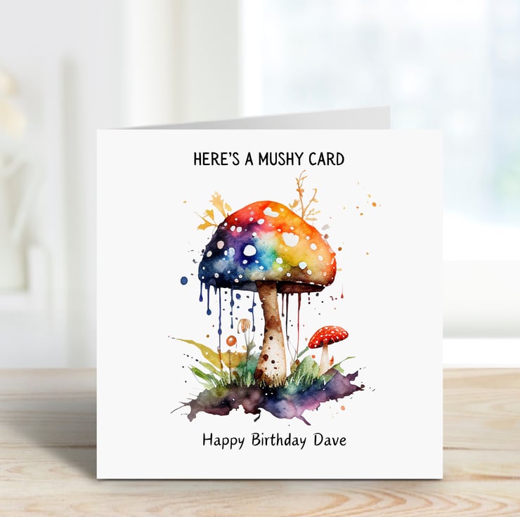 Mushy birthday card featuring a watercolour psychedelic mushroom design