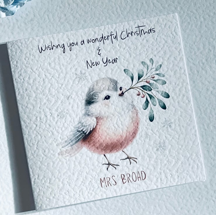 Christmas card can be personalised for recipient, cute bird robin in watercolour pinks, can be for any name, relation, friend, teacher or hairdresser