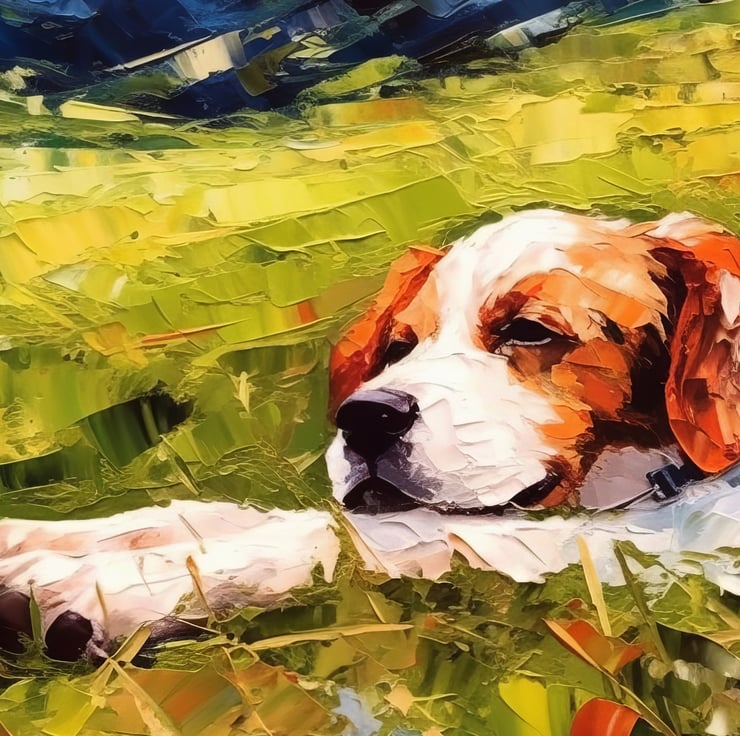 Captivate the hearts of canine aficionados with our "Vibrant Beagle Art Print," a 5x7 oil painting that bursts with life and color. This artwork showcases a beagle in repose, rendered in an array of bright, exuberant colors that reflect the breed's lively personality and charm.