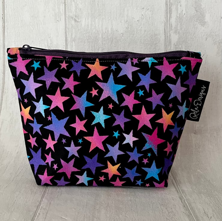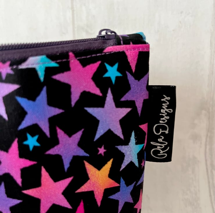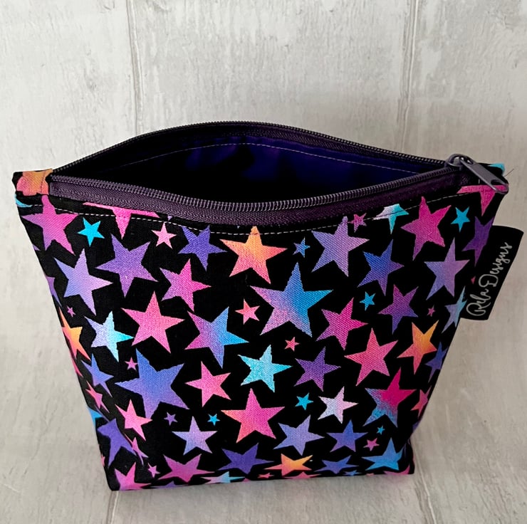 This star print cotton zipped pouch has a purple waterproof nylon lining , great for those inevitable spills.