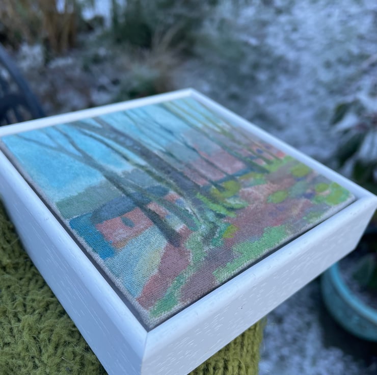 This is a painting of the boat house at Talkin Tarn in Cumbria, view from the woods above. Talkin Tarn is a favourite spot for walkers, rowers etc. It is painted on linen and framed in a simple, white frame.