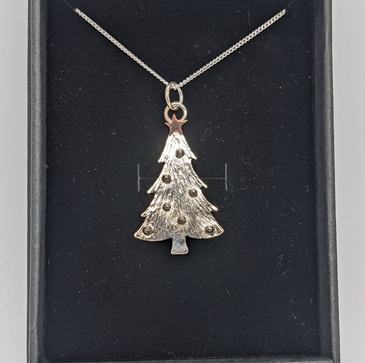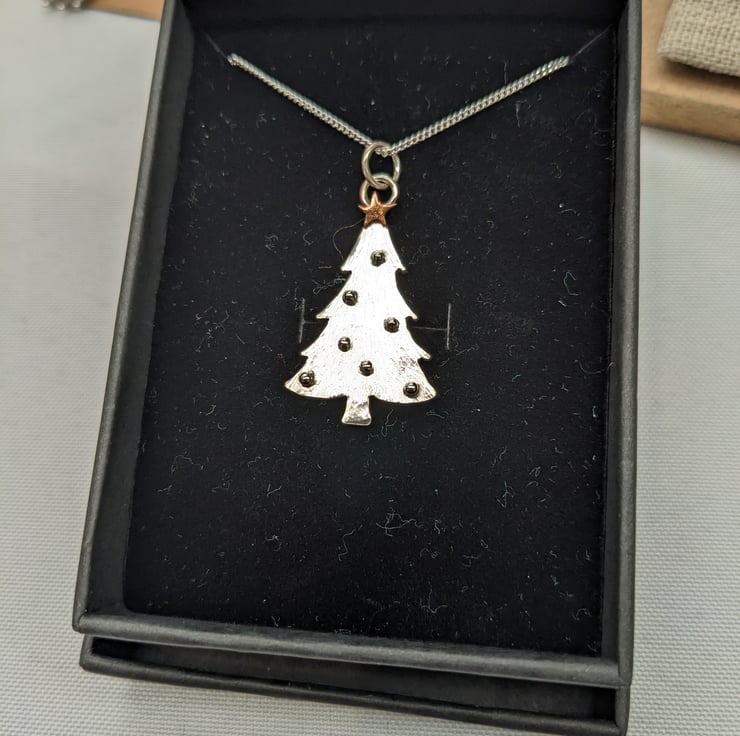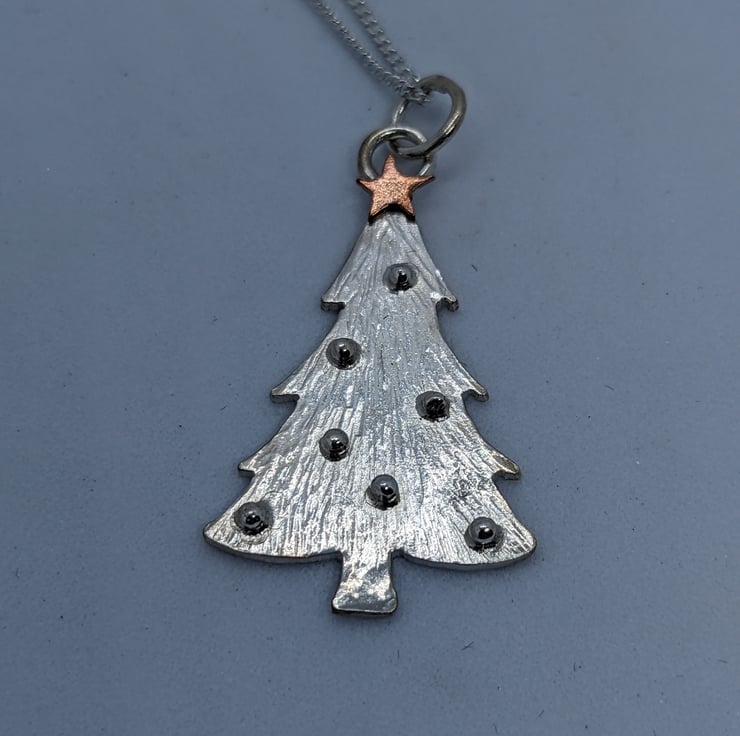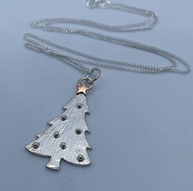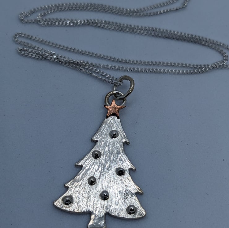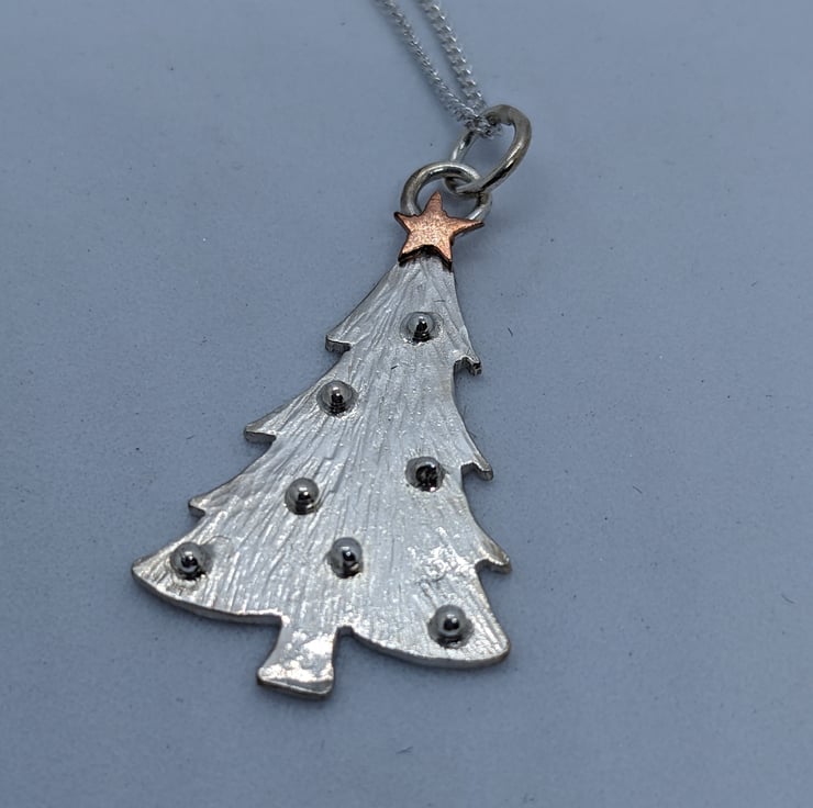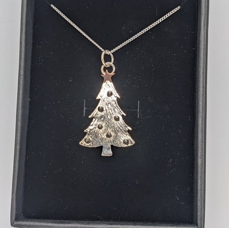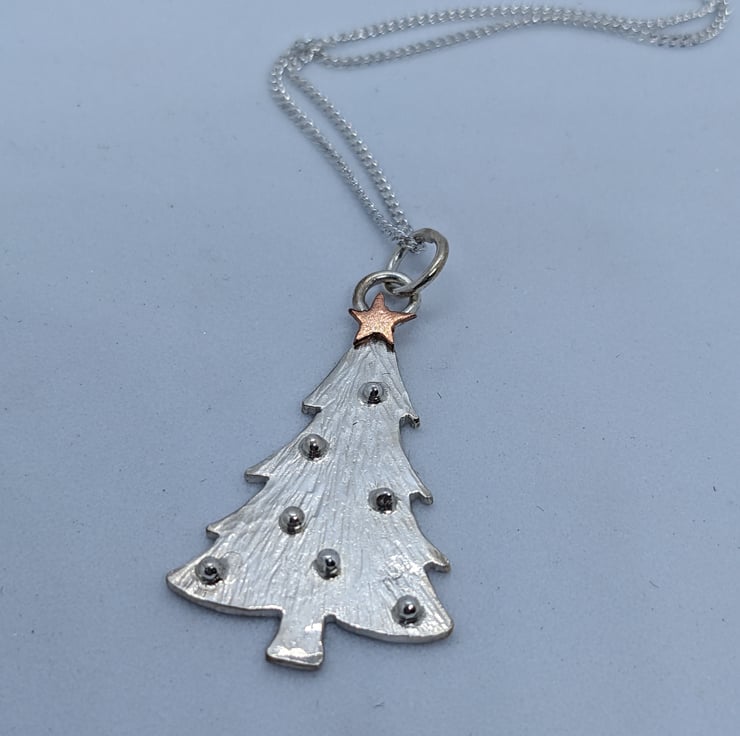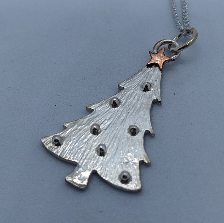 This beautiful sterling silver and copper pendant is completely handmade to my original design. The Christmas tree has been hand drawn and hand saw pierced from silver sheet. The tree has been hammered to create a textured finish and then tiny granulated silver balls have been used for baubles. The tiny copper star was hand saw pierced and only a few were last on the workshop floor in the process!
