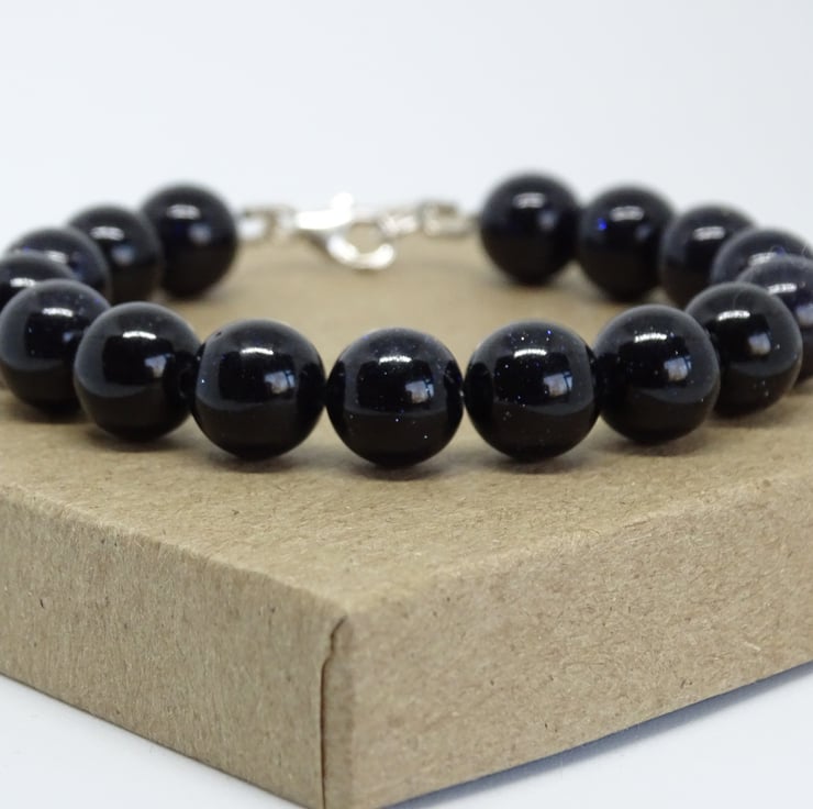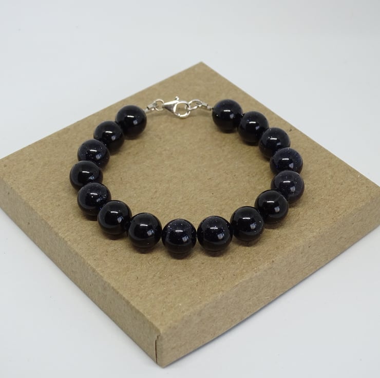 This bracelet is made with Blue Goldstone beads and is secured with a sterling silver lobster clasp fastening.