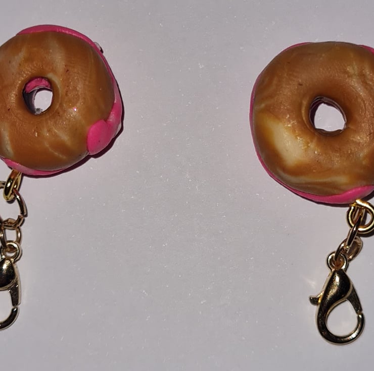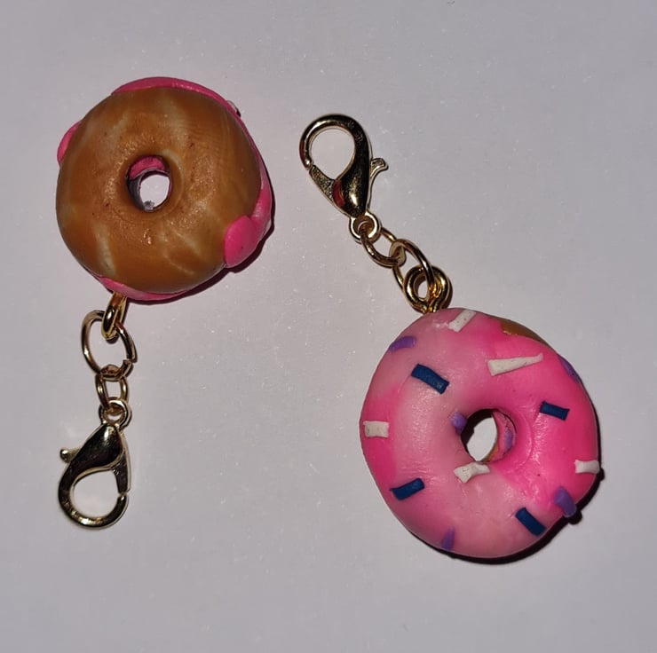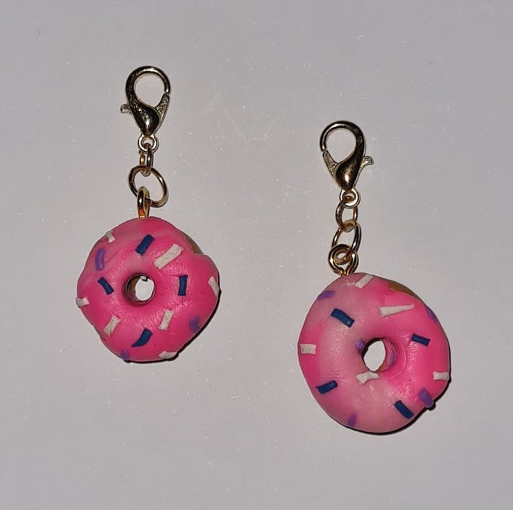 Two deliciously sweet doughnut bag charms. These delightful polymer-clay doughnuts have a pink icing with blue and white sprinkles. These matching bag charms will make a fantastic gift for you and your best friend. These are 4 cm long including the gold coloured metal clasp finish.The dangle is 2.5 cm long, 1.7 cm wide and are 1 cm thick.