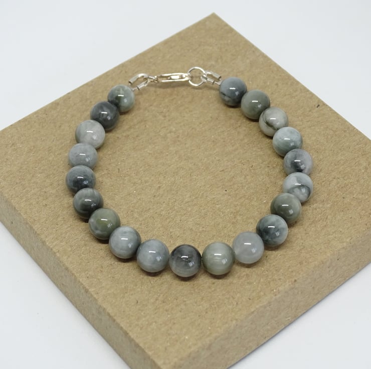 This bracelet has been made with Natural Eagle Eye beads and is secured with a sterling silver lobster clasp fastening.
