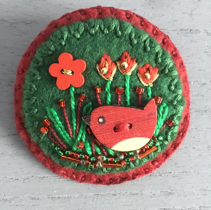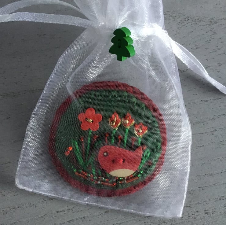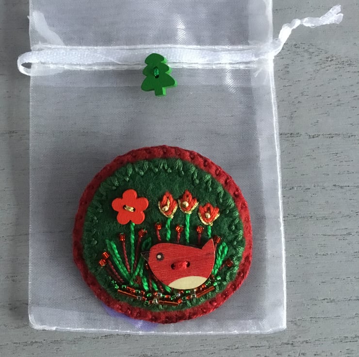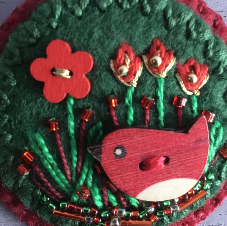 This hand embroidered brooch has a Winter garden scene embroidered onto circles of green and red felt. A wooden Robin button is stitched among a border of red and golden winter flowers in the garden. These are hand embroidered in Long, Fly and Lazy Daisy Stitches, decorated with golden, green and red beads……that twinkle in the light….