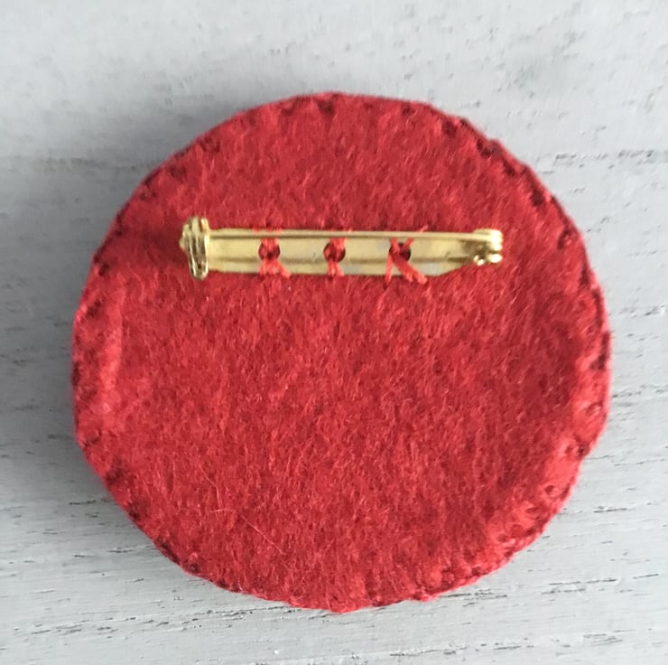 This Hand Embroidered Garden Robin Brooch is 2.50 inches (6.50 cms) in diameter with a metal brooch pin with a safety catch for secure wear, sewn onto the back.