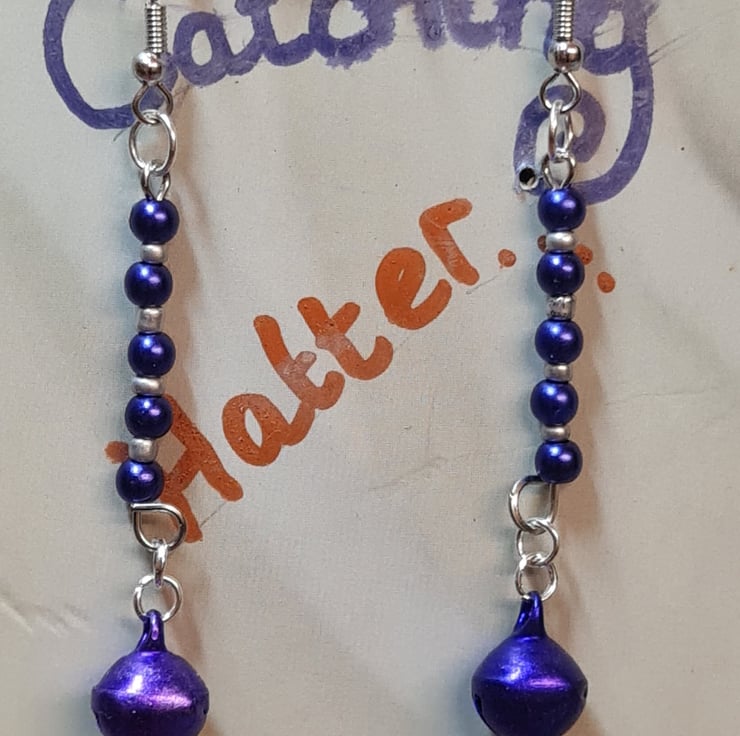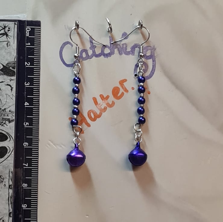 Stunning deep purple and silver long drop beaded earrings, finished with a real purple bells. These gorgeous earrings are made up from a repeating pattern of purple and silver beads. Great for all occasions. The earrings are 7 cm long including the silver coloured metal earring hooks. The dangle is 5 cm long, 0.9 cm wide and are 0.7 cm thick.