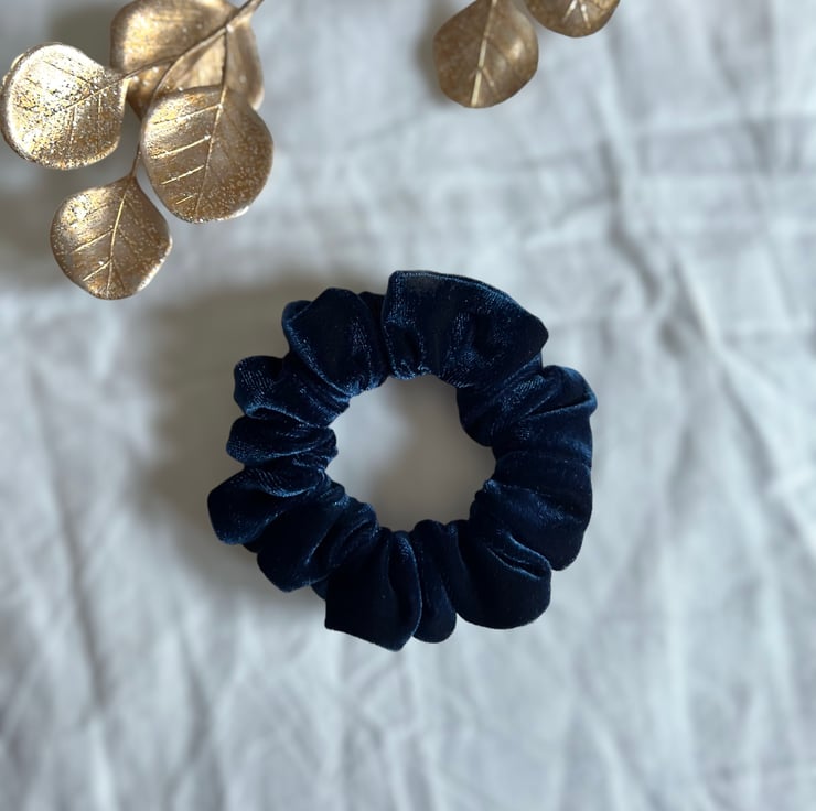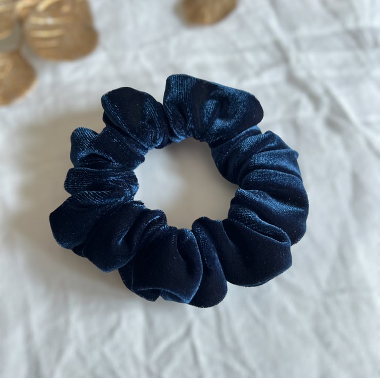 Soft, navy velvet scrunchies handmade by me.