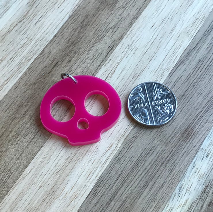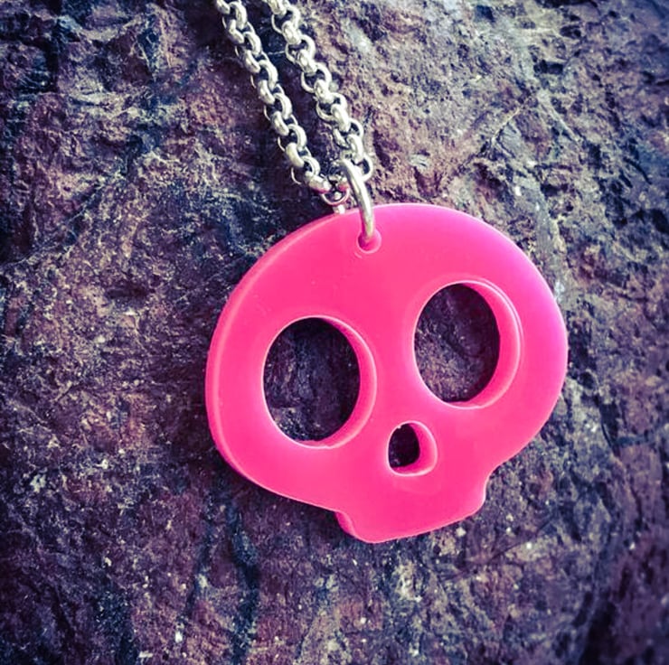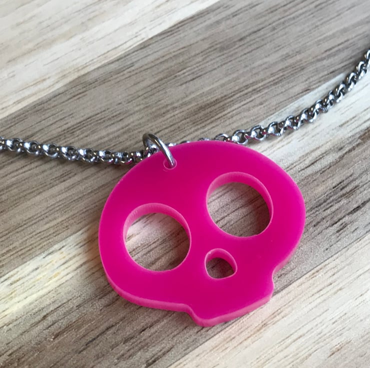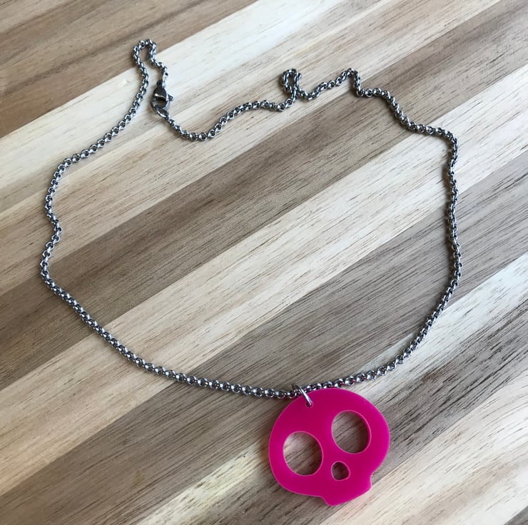 Each necklace is made from a Pink colour 3cmx2.6cm, 3mm thick laser cut Acrylic Skull charm. It is finished with Stainless Steel jump rings and a 18inch, 2.5x1mm Stainless Steel Rolo Chain with Stainless Steel Lobster Claw Clasp. This chain can be made in different lengths. If you would like a different length chain please send me a message to discuss. Longer length chains may incur additional costs. Perfume should not be sprayed directly onto your items as it may damage them.