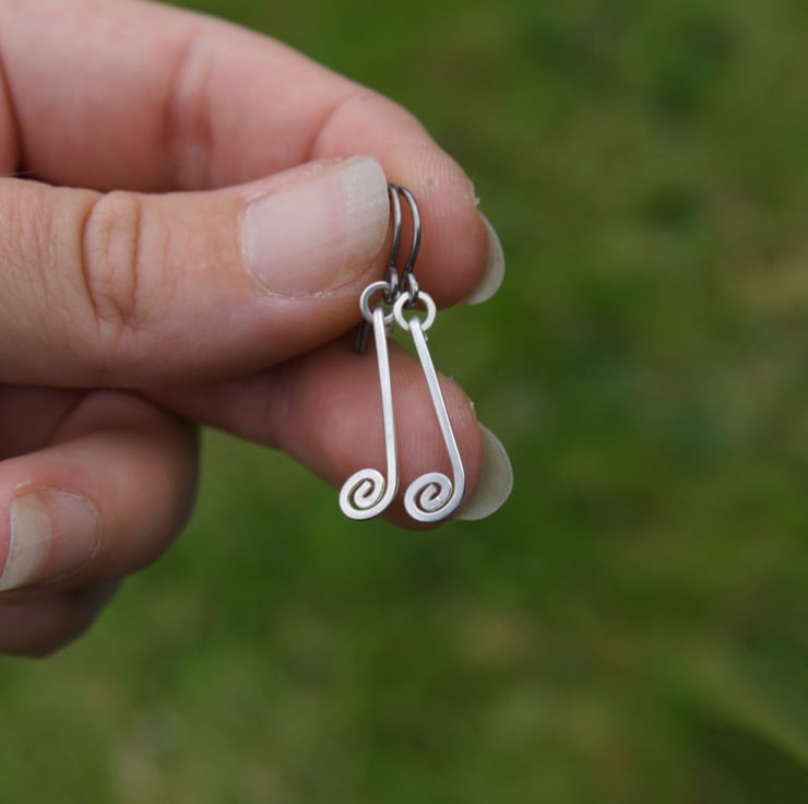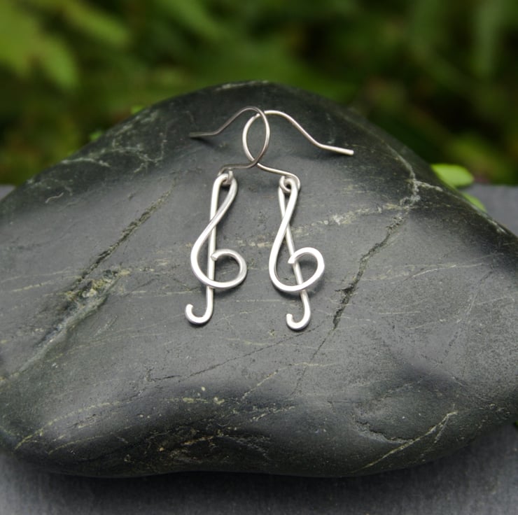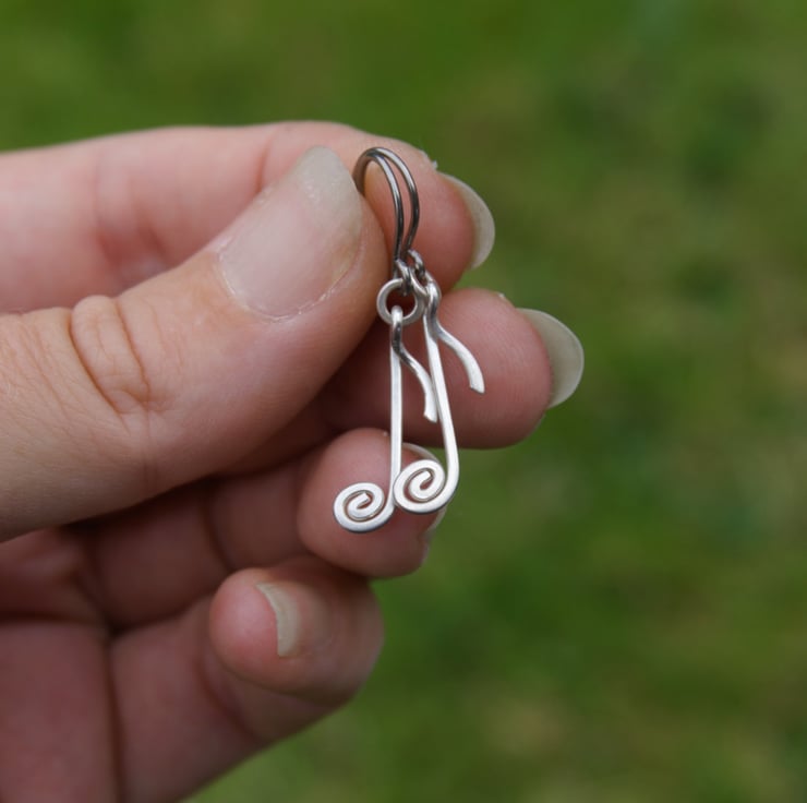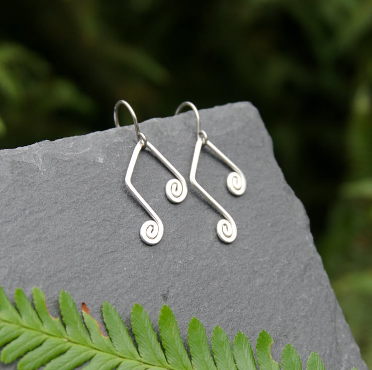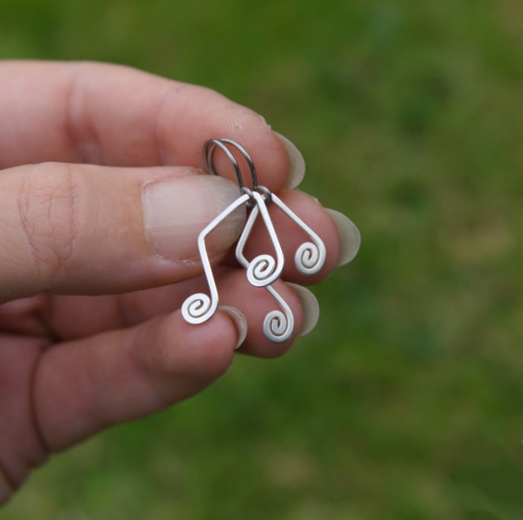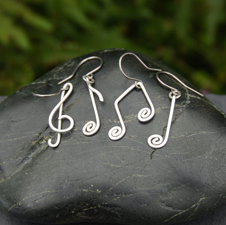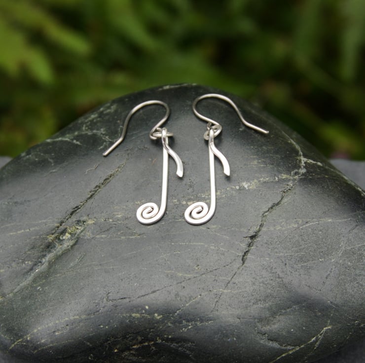 These sweet and simple musical note earrings are handmade from sterling silver wire. They are available as a matching pair or mis-matched, with four designs to choose from: treble clef, double note, crotchet and quaver (the one with the little tail!). Each earring has been created from a single length of sterling silver wire, which has been shaped, hammered and hand-polished. A perfect gift for the music lover in your life!