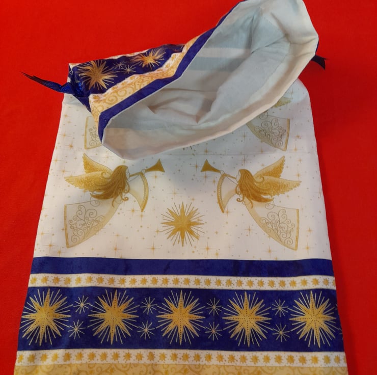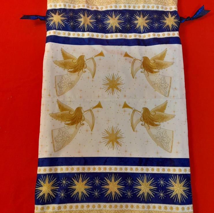 Large bag:- Cream, Gold and Blue fabric depicting trumpeting Angels. Lined with plain cream cotton, measuring 27cm x 46cm.
