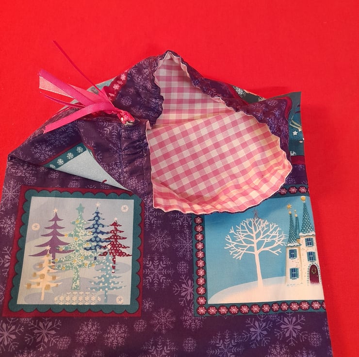 Medium bag:- Purple, pink, blue and white fabric with snowy scenes. Lined with pink checked fabric. Measures 27cm x 33cm.