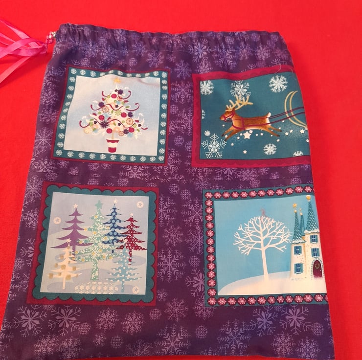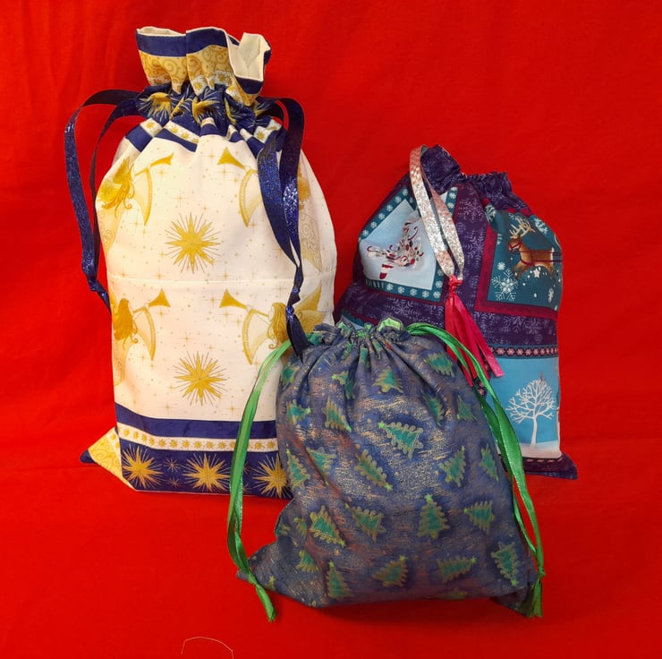 Small, Medium and Large, fabric Christmas Gift Bags. Fully lined with ribbon drawstrings.