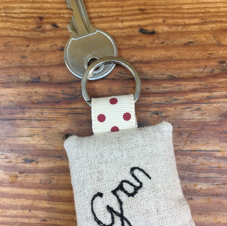 A beautiful fun keyring for a Gran with a bright lime green heart appliquéd onto one side of the linen square and ‘Gran’ free machine embroidered onto the other side.