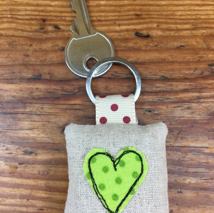 The key ring is 8 cms long with a 2.5 cm split ring and a 4.5 cm linen square filled with lavender.