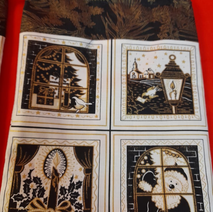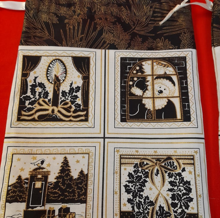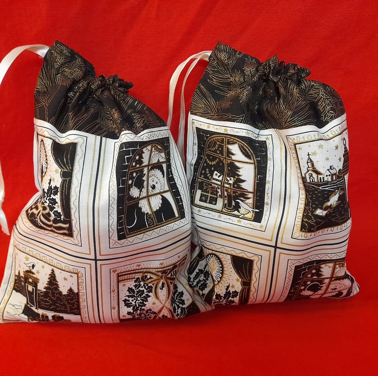 Black, Gold and Cream fabric, depicting Christmas scenes. The bags are lined with black fabric.