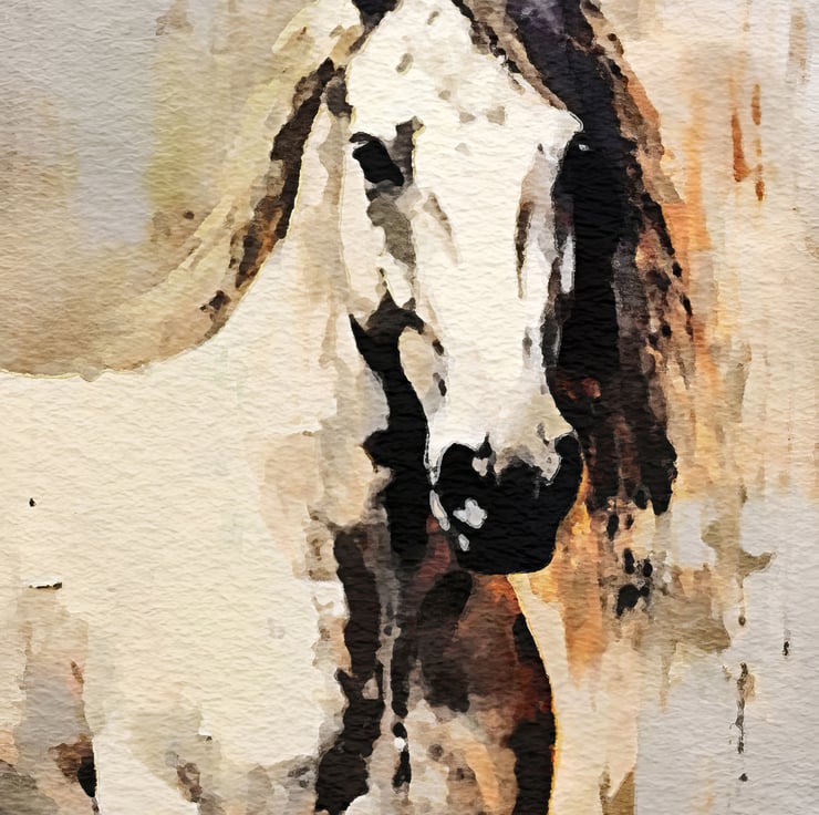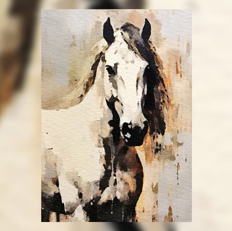 Embrace the nobility of the equine spirit with this Majestic Horse Art Print. At a convenient 5"x7", this print captures the essence of the horse's strength and grace. The bold strokes and abstract background accentuate the horse's dignified pose, making it a standout piece for any collector or horse enthusiast.