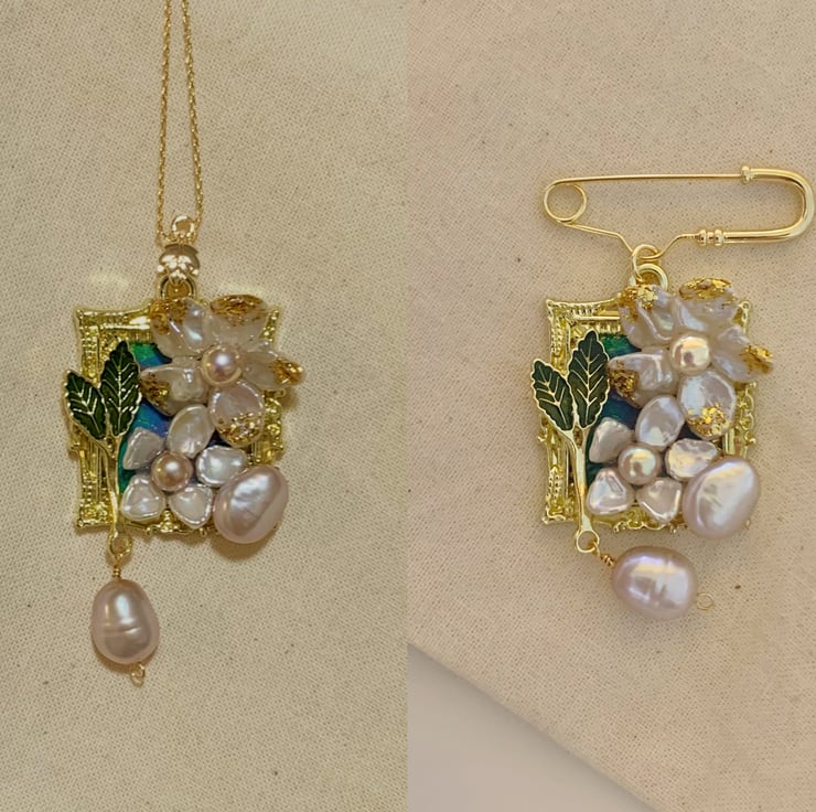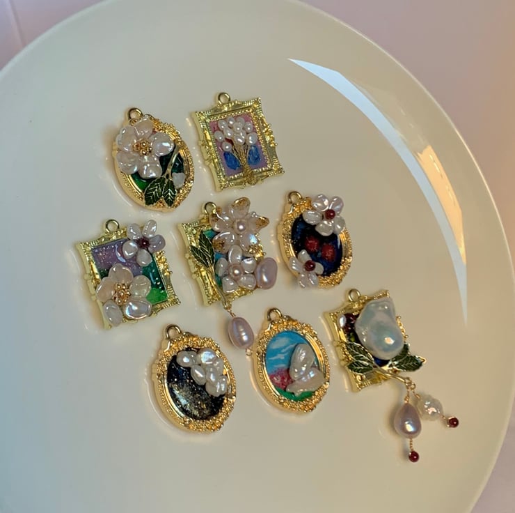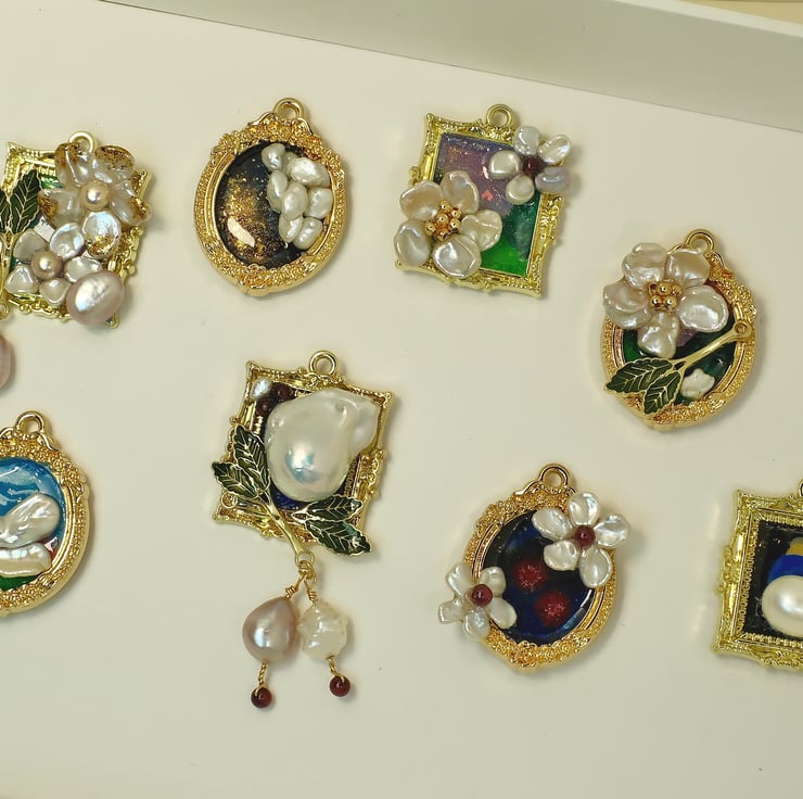Pearl-framed artworks can be crafted into a pendant or a brooch. Size: 35mm.26mm (Oval), 33mm.27mm (Square).
