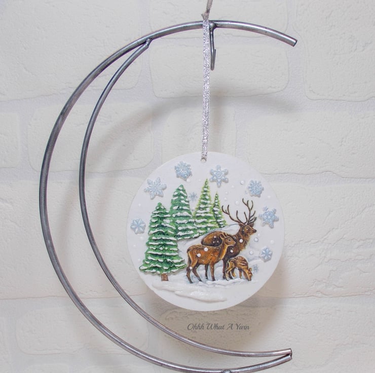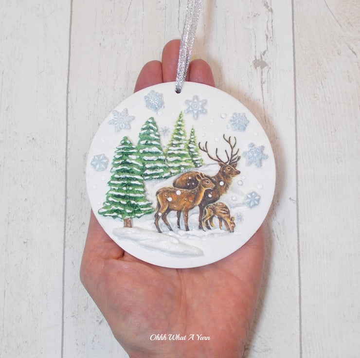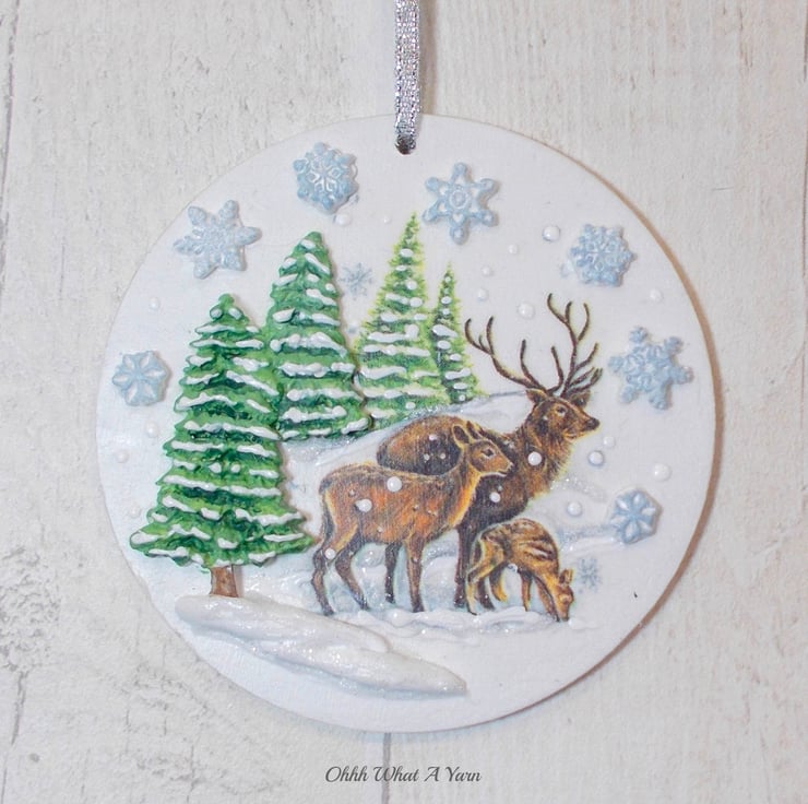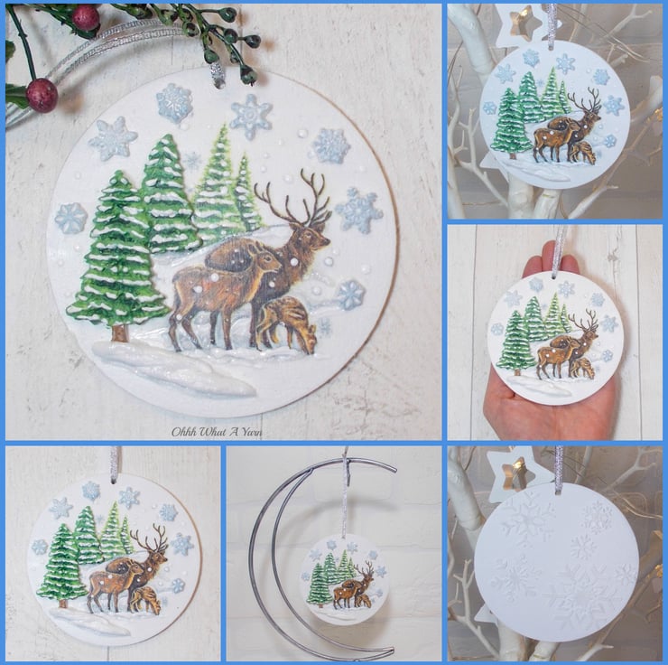 I have decoupaged it with a winter deers napkin. I have added hand painted details to the deer image including some glittery snowy 3D effect paint. I have also added 2 air dry clay 3D trees and air dry clay snowflakes which I have painted with acrylic paints.