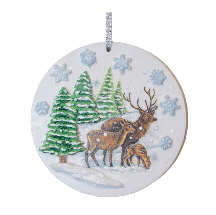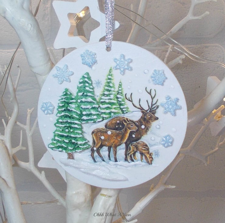 This pretty winter deer decoration has been created on a 10cm MDF circle.